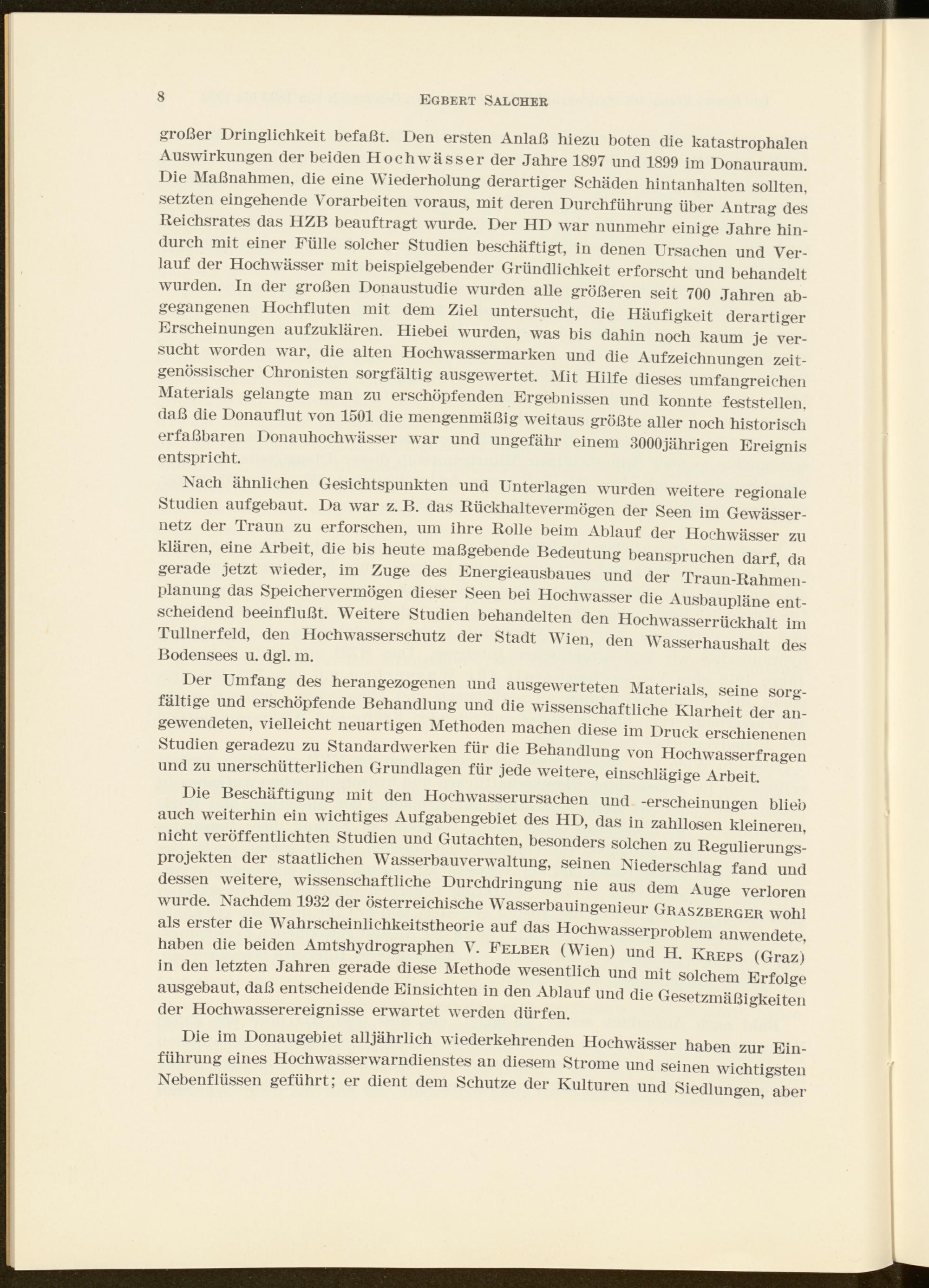 Die Beschäftigung mit den Hochwasserursachen und -erscheinungen blieb auch weiterhin ein wichtiges Aufgabengebiet des HD, das in zahllosen kleineren, nicht veröffentlichten Studien und Gutachten, besonders solchen zu Regulierungsprojekten der staatlichen Wasserbauverwaltung, seinen Niederschlag fand und dessen weitere, wissenschaftliche Durchdringung nie aus dem Auge verloren wurde. Nachdem 1932 der österreichische Wasserbauingenieur Graszberger wohl als erster die Wahrscheinlichkeitstheorie auf das Hochwasserproblem anwendete, haben die beiden Amtshydrographen V. Felber (Wien) und H. Kreps (Graz) in den letzten Jahren gerade diese Methode wesentlich und mit solchem Erfolge ausgebaut, daß entscheidende Einsichten in den Ablauf und die Gesetzmäßigkeiten der Hochwasserereignisse erwartet werden dürfen.