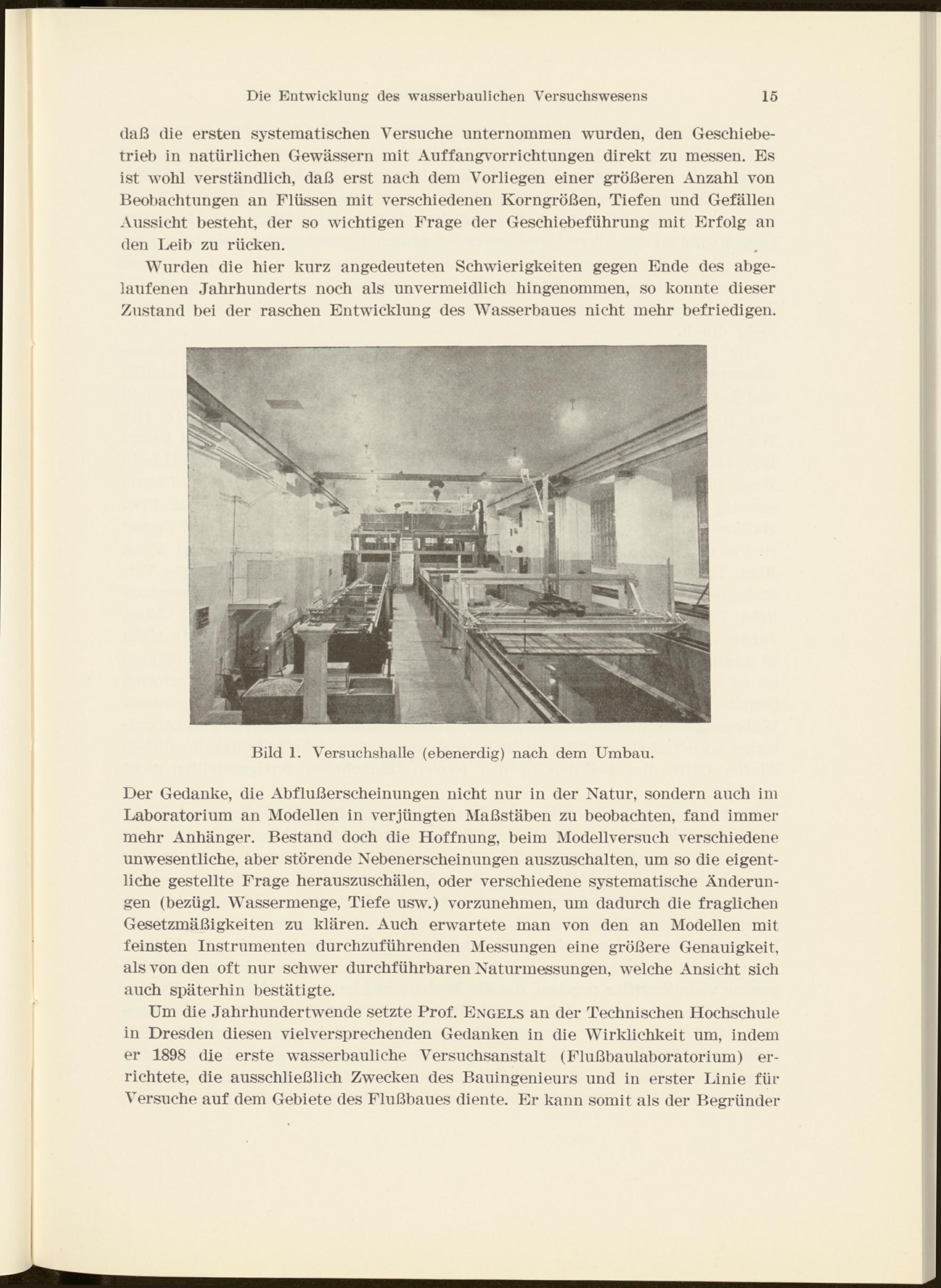 Um die Jahrhundertwende setzte Prof. Engels an der Technischen Hochschule in Dresden diesen vielversprechenden Gedanken in die Wirklichkeit um, indem er 1898 die erste wasserbauliche Versuchsanstalt (Flußbaulaboratorium) errichtete, die ausschließlich Zwecken des Bauingenieurs und in erster Linie für Versuche auf dem Gebiete des Flußbaues diente. Er kann somit als der Begründer
