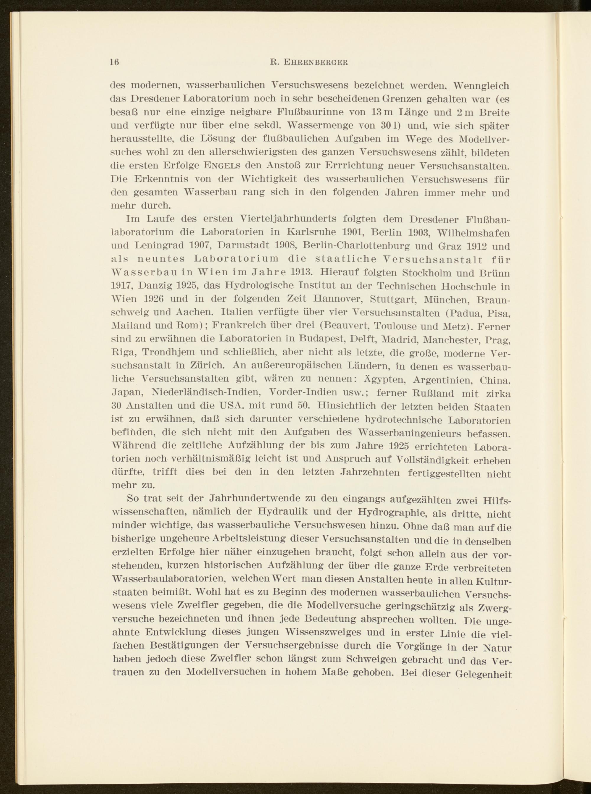des modernen, wasserbaulichen Versuchswesens bezeichnet werden. Wenngleich das Dresdener Laboratorium noch in sehr bescheidenen Grenzen gehalten war (es besaß nur eine einzige neigbare Flußbaurinne von 13 m Länge und 2 m Breite und verfügte nur über eine sekdl. Wassermenge von 301) und, wie sich später herausstellte, die Lösung der flußbaulichen Aufgaben im Wege des Modellversuches wohl zu den allerschwierigsten des ganzen Versuchswesens zählt, bildeten die ersten Erfolge Engels den Anstoß zur Errichtung neuer Versuchsanstalten. Die Erkenntnis von der Wichtigkeit des wasserbaulichen Versuchswesens für den gesamten Wasserbau rang sich in den folgenden Jahren immer mehr und mehr durch.