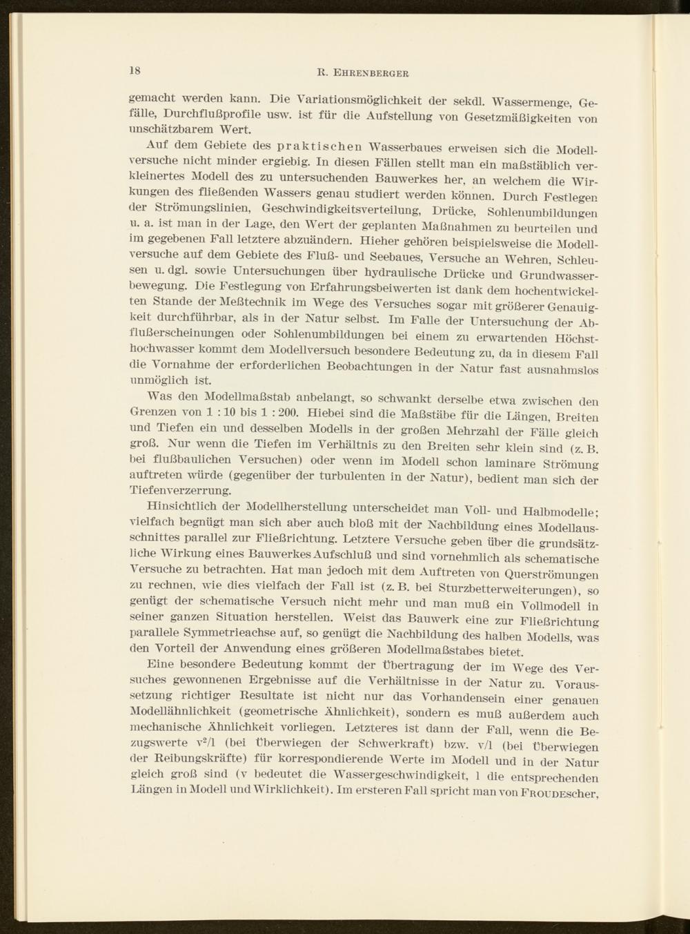 Eine besondere Bedeutung kommt der Übertragung der im Wege des Versuches gewonnenen Ergebnisse auf die Verhältnisse in der Natur zu. Voraussetzung richtiger Resultate ist nicht nur das Vorhandensein einer genauen Modellähnlichkeit (geometrische Ähnlichkeit), sondern es muß außerdem auch mechanische Ähnlichkeit vorliegen. Letzteres ist dann der Fall, wenn die Bezugswerte v 2 /l (bei überwiegen der Schwerkraft) bzw. v/1 (bei überwiegen der Reibungskräfte) für korrespondierende Werte im Modell und in der Natur gleich groß sind (v bedeutet die Wassergeschwindigkeit, 1 die entsprechenden Längen in Modell und Wirklichkeit). Im ersterenFall spricht man von FROUDEscher,