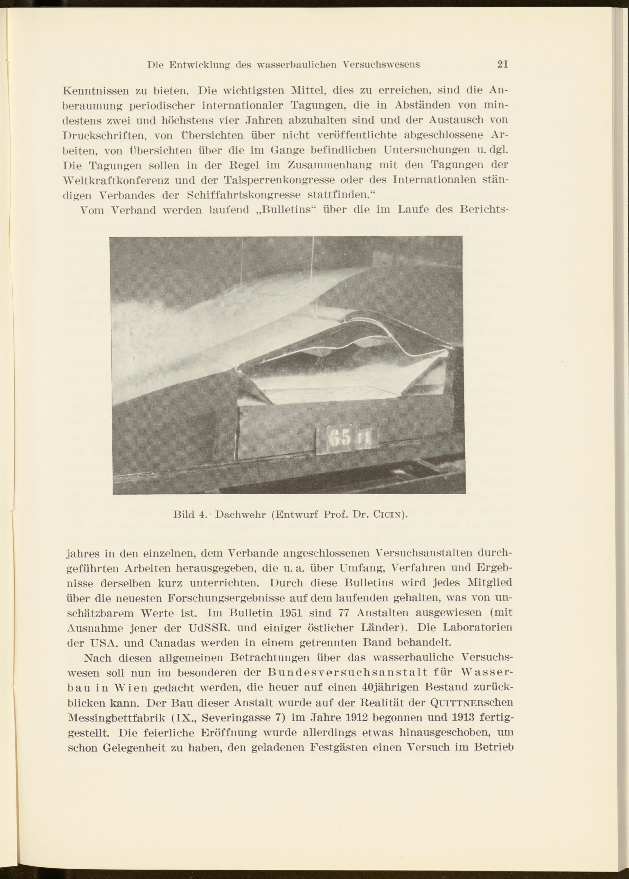 Nach diesen allgemeinen Betrachtungen über das wasserbauliche Versuchswesen soll nun im besonderen der Bundes Versuchsanstalt für Wasserbau in Wien gedacht werden, die heuer auf einen 40jährigen Bestand zurückblicken kann. Der Bau dieser Anstalt wurde auf der Realität der QuiTTNERSchen Messingbettfabrik (IX., Severingasse 7) im Jahre 1912 begonnen und 1913 fertiggestellt. Die feierliche Eröffnung wurde allerdings etwas hinausgeschoben, um schon Gelegenheit zu haben, den geladenen Festgästen einen Versuch im Betrieb