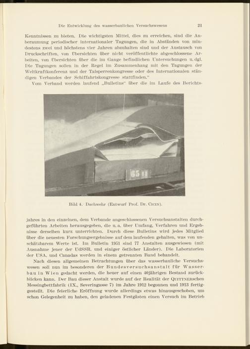 Kenntnissen zu bieten. Die wichtigsten Mittel, dies zu erreichen, sind die Anberaumung periodischer internationaler Tagungen, die in Abständen von mindestens zwei und höchstens vier Jahren abzuhalten sind und der Austausch von Druckschriften, von Übersichten über nicht veröffentlichte abgeschlossene Arbeiten, von Übersichten über die im Gange befindlichen Untersuchungen u. dgl. Die Tagungen sollen in der Regel im Zusammenhang mit den Tagungen der Weltkraftkonferenz und der Talsperrenkongresse oder des Internationalen ständigen Verbandes der Schiffahrtskongresse stattfinden.“