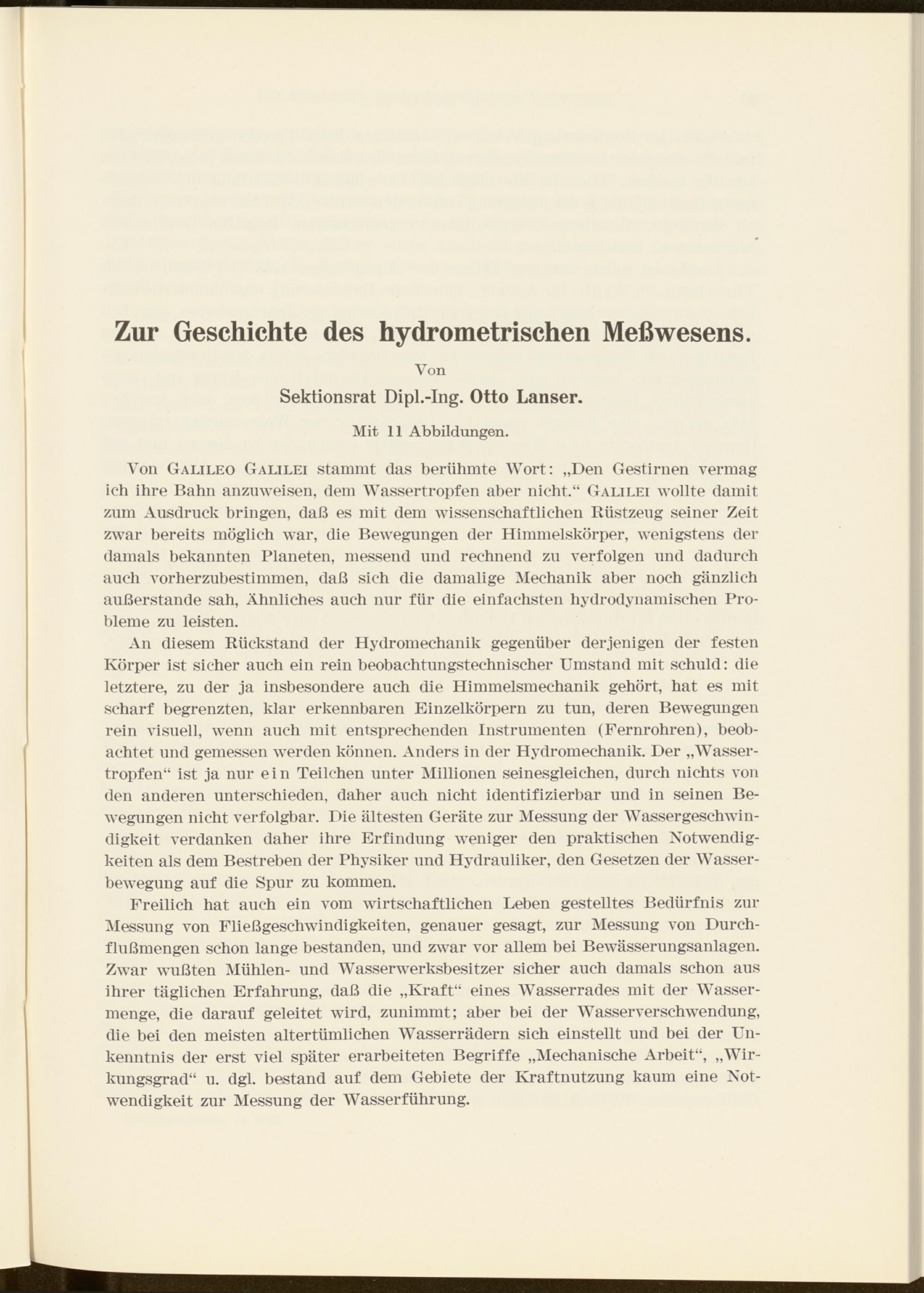 An diesem Rückstand der Hydromechanik gegenüber derjenigen der festen Körper ist sicher auch ein rein beobachtungstechnischer Umstand mit schuld: die letztere, zu der ja insbesondere auch die Himmelsmechanik gehört, hat es mit scharf begrenzten, klar erkennbaren Einzelkörpern zu tun, deren Bewegungen rein visuell, wenn auch mit entsprechenden Instrumenten (Fernrohren), beobachtet und gemessen werden können. Anders in der Hydromechanik. Der „Wassertropfen“ ist ja nur ein Teilchen unter Millionen seinesgleichen, durch nichts von den anderen unterschieden, daher auch nicht identifizierbar und in seinen Bewegungen nicht verfolgbar. Die ältesten Geräte zur Messung der Wassergeschwin- digkeit verdanken daher ihre Erfindung weniger den praktischen Notwendigkeiten als dem Bestreben der Physiker und Hydrauliker, den Gesetzen der Wasserbewegung auf die Spur zu kommen.