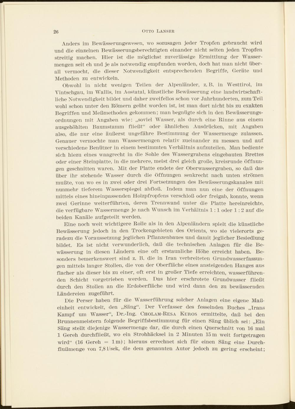 Anders im Bewässerungswesen, wo sozusagen jeder Tropfen gebraucht wird und die einzelnen Bewässerungsberechtigten einander nicht selten jeden Tropfen streitig machen. Hier ist die möglichst zuverlässige Ermittlung der Wassermengen seit eh und je als notwendig empfunden worden, doch hat man nicht überall vermocht, die dieser Notwendigkeit entsprechenden Begriffe, Geräte und Methoden zu entwickeln.