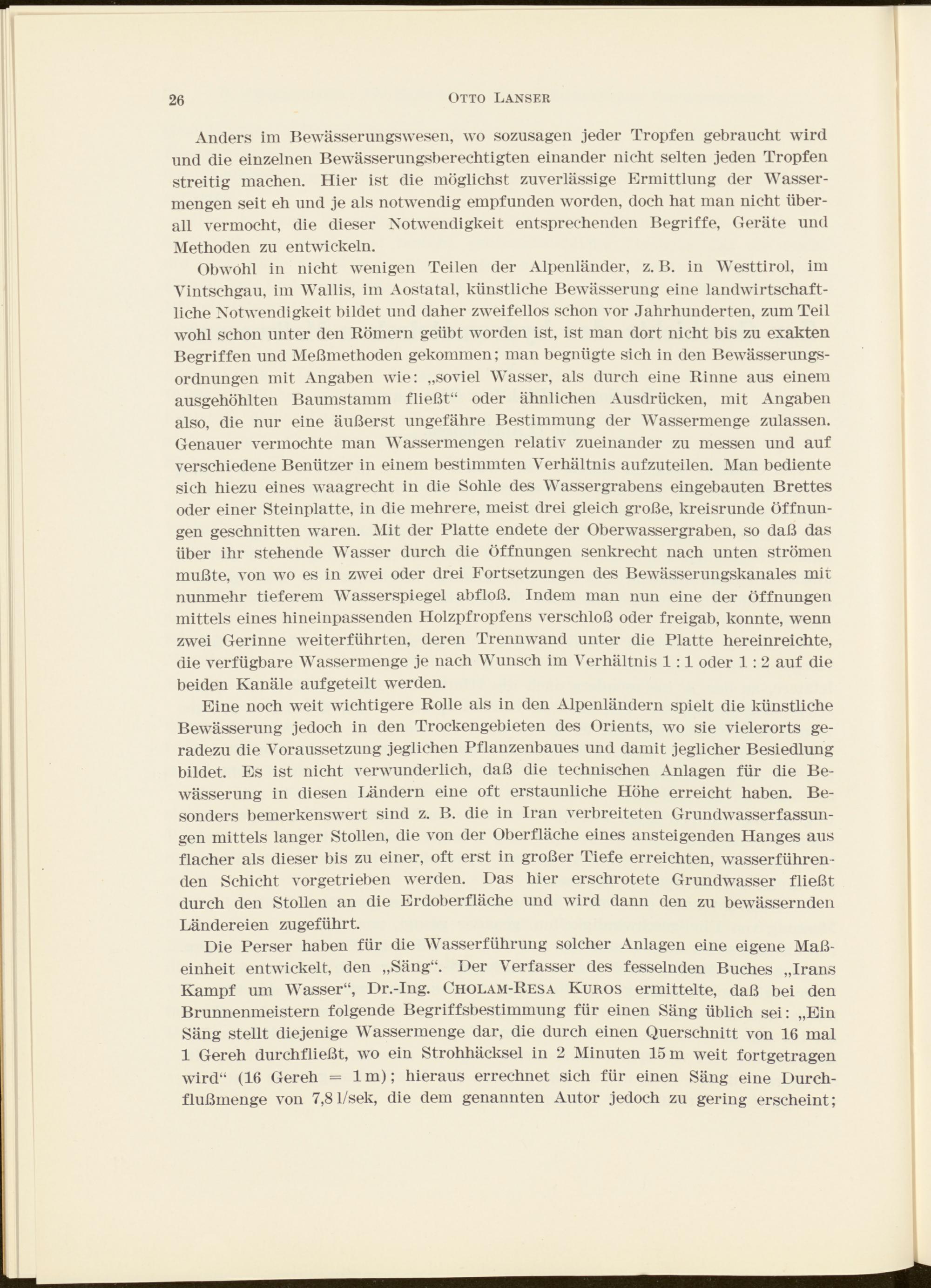Die Perser haben für die Wasserführung solcher Anlagen eine eigene Maßeinheit entwickelt, den „Säng“. Der Verfasser des fesselnden Buches „Irans Kampf um Wasser“, Dr.-Ing. Cholam-Resa Kuros ermittelte, daß bei den Brunnenmeistern folgende Begriffsbestimmung für einen Säng üblich sei: „Ein Säng stellt diejenige Wassermenge dar, die durch einen Querschnitt von 16 mal 1 Gereh durchfließt, wo ein Strohhäcksel in 2 Minuten 15 m weit fortgetragen wird“ (16 Gereh = lm); hieraus errechnet sich für einen Säng eine Durchflußmenge von 7,81/sek, die dem genannten Autor jedoch zu gering erscheint;