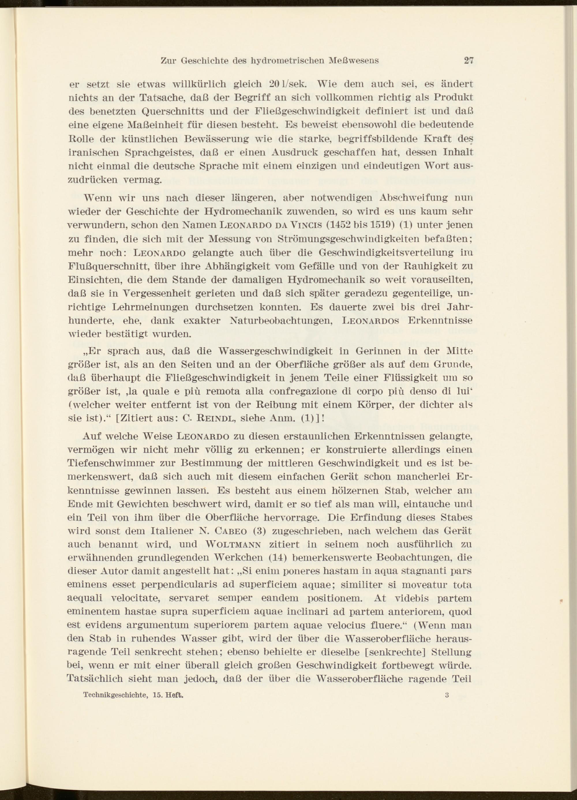 Wenn wir uns nach dieser längeren, aber notwendigen Abschweifung nun wieder der Geschichte der Hydromechanik zuwenden, so wird es uns kaum sehr verwundern, schon den Namen Leonardo da Vincis (1452 bis 1519) (1) unter jenen zu finden, die sich mit der Messung von Strömungsgeschwindigkeiten befaßten; mehr noch: Leonardo gelangte auch über die Geschwindigkeitsverteilung im Flußquerschnitt, über ihre Abhängigkeit vom Gefälle und von der Rauhigkeit zu Einsichten, die dem Stande der damaligen Hydromechanik so weit vorauseilten, daß sie in Vergessenheit gerieten und daß sich später geradezu gegenteilige, unrichtige Lehrmeinungen durchsetzen konnten. Es dauerte zwei bis drei Jahrhunderte, ehe, dank exakter Naturbeobachtungen, Leonardos Erkenntnisse wieder bestätigt wurden.