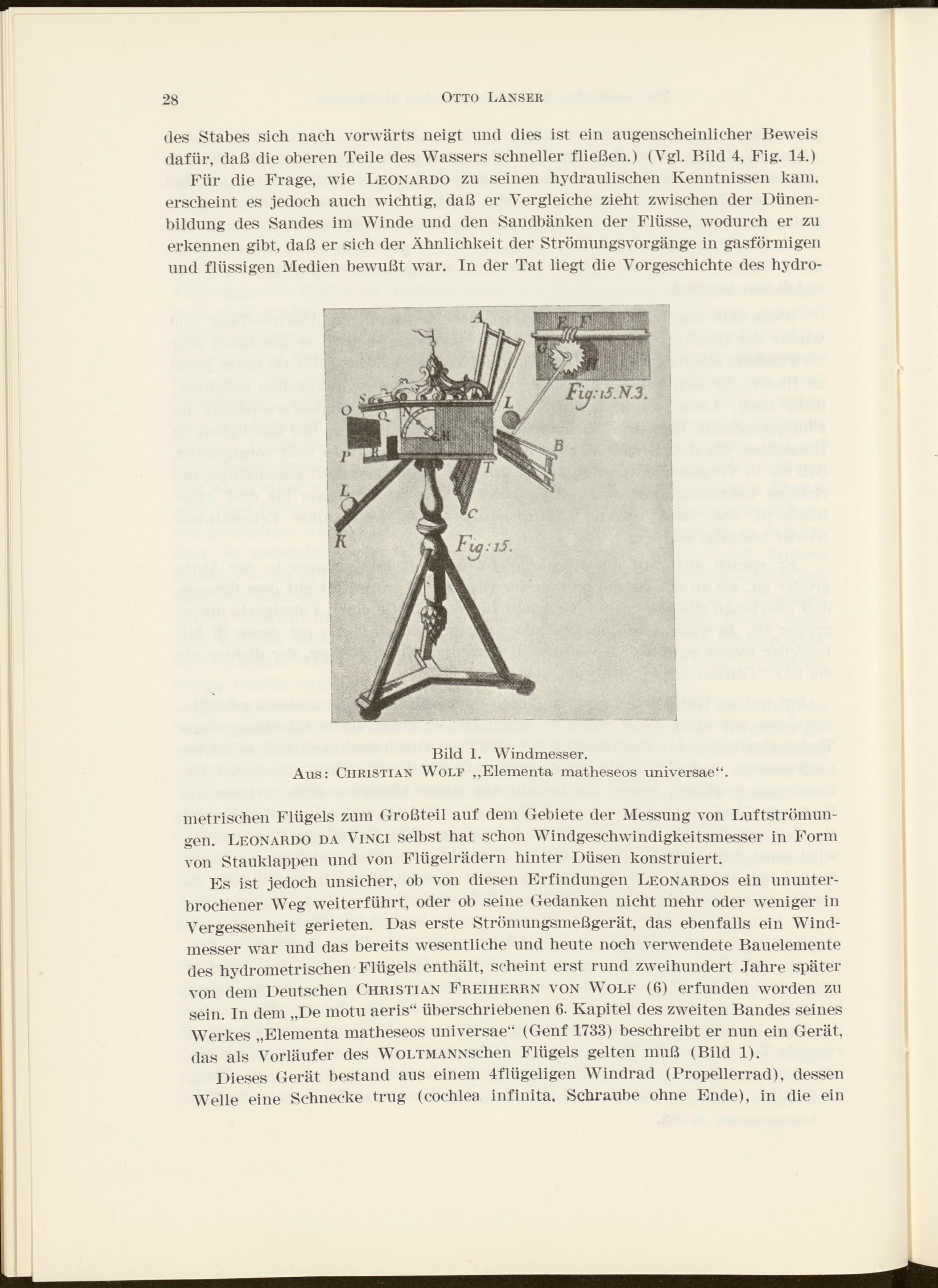 Es ist jedoch unsicher, ob von diesen Erfindungen Leonardos ein ununterbrochener Weg weiterführt, oder ob seine Gedanken nicht mehr oder weniger in Vergessenheit gerieten. Das erste Strömungsmeßgerät, das ebenfalls ein Windmesser war und das bereits wesentliche und heute noch verwendete Bauelemente des hydrometrischen Flügels enthält, scheint erst rund zweihundert Jahre später von dem Deutschen Christian Freiherrn von Wolf (6) erfunden worden zu sein. In dem „De motu aeris“ überschriebenen 6. Kapitel des zweiten Bandes seines Werkes „Elementa matheseos universae“ (Genf 1733) beschreibt er nun ein Gerät, das als Vorläufer des WoLTMANNschen Flügels gelten muß (Bild 1).