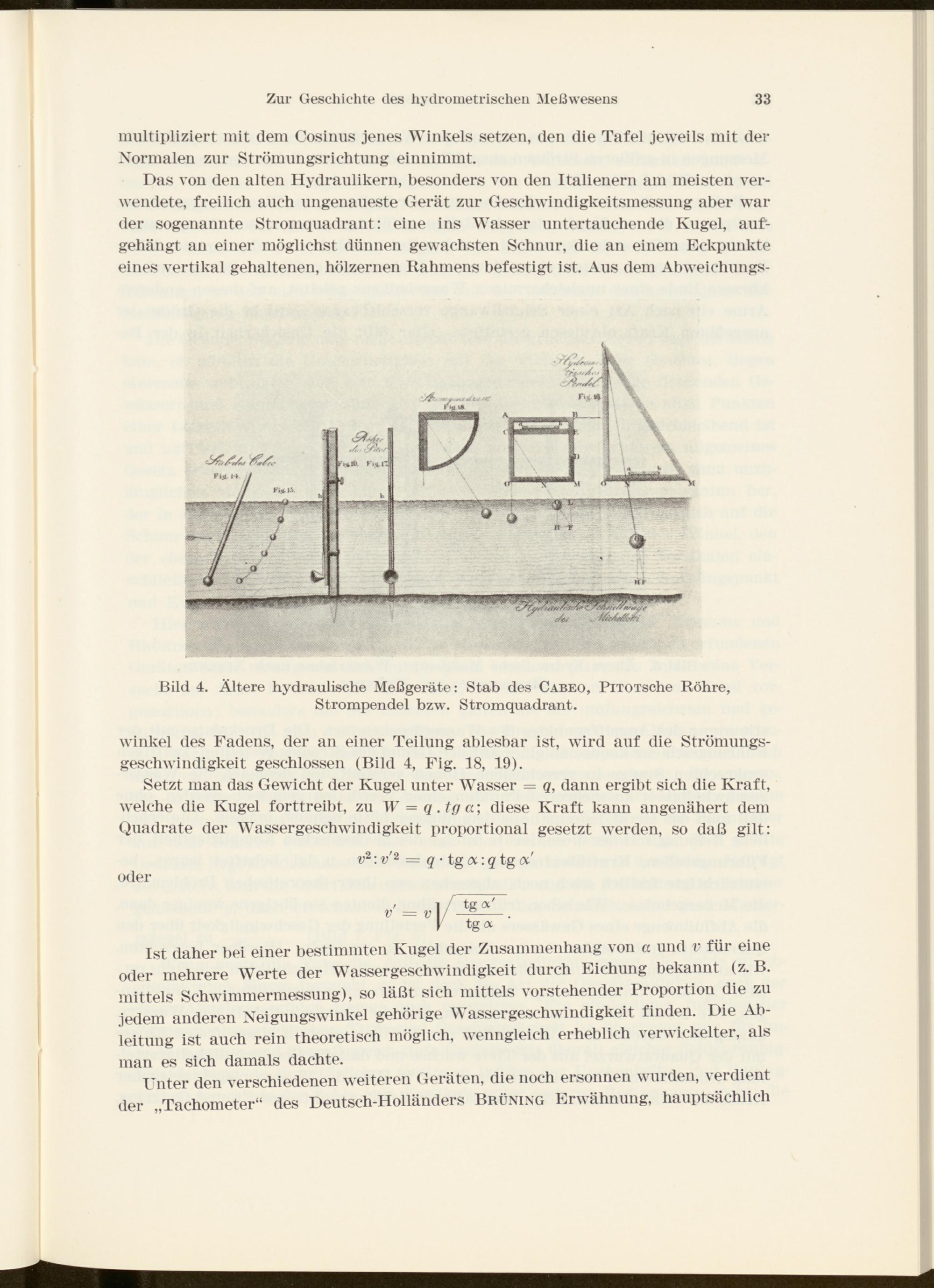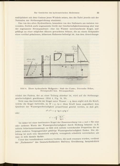 Das von den alten Hydraulikern, besonders von den Italienern am meisten verwendete, freilich auch ungenaueste Gerät zur Geschwindigkeitsmessung aber warder sogenannte Stromquadrant: eine ins Wasser untertauchende Kugel, aufgehängt an einer möglichst dünnen gewachsten Schnur, die an einem Eckpunkte eines vertikal gehaltenen, hölzernen Kähmens befestigt ist. Aus dem Abweichungs-