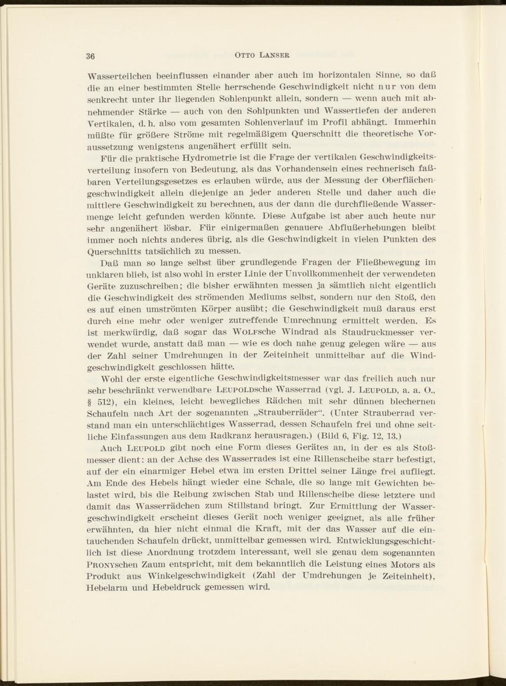 Für die praktische Hydrometrie ist die Frage der vertikalen Geschwindigkeitsverteilung insofern von Bedeutung, als das Vorhandensein eines rechnerisch faßbaren Verteilungsgesetzes es erlauben würde, aus der Messung der Oberflächen geschwindigkeit allein diejenige an jeder anderen Stelle und daher auch die mittlere Geschwindigkeit zu berechnen, aus der dann die durchfließende Wassermenge leicht gefunden werden könnte. Diese Aufgabe ist aber auch heute nur sehr angenähert lösbar. Für einigermaßen genauere Abflußerhebungen bleibt immer noch nichts anderes übrig, als die Geschwindigkeit in vielen Punkten des Querschnitts tatsächlich zu messen.