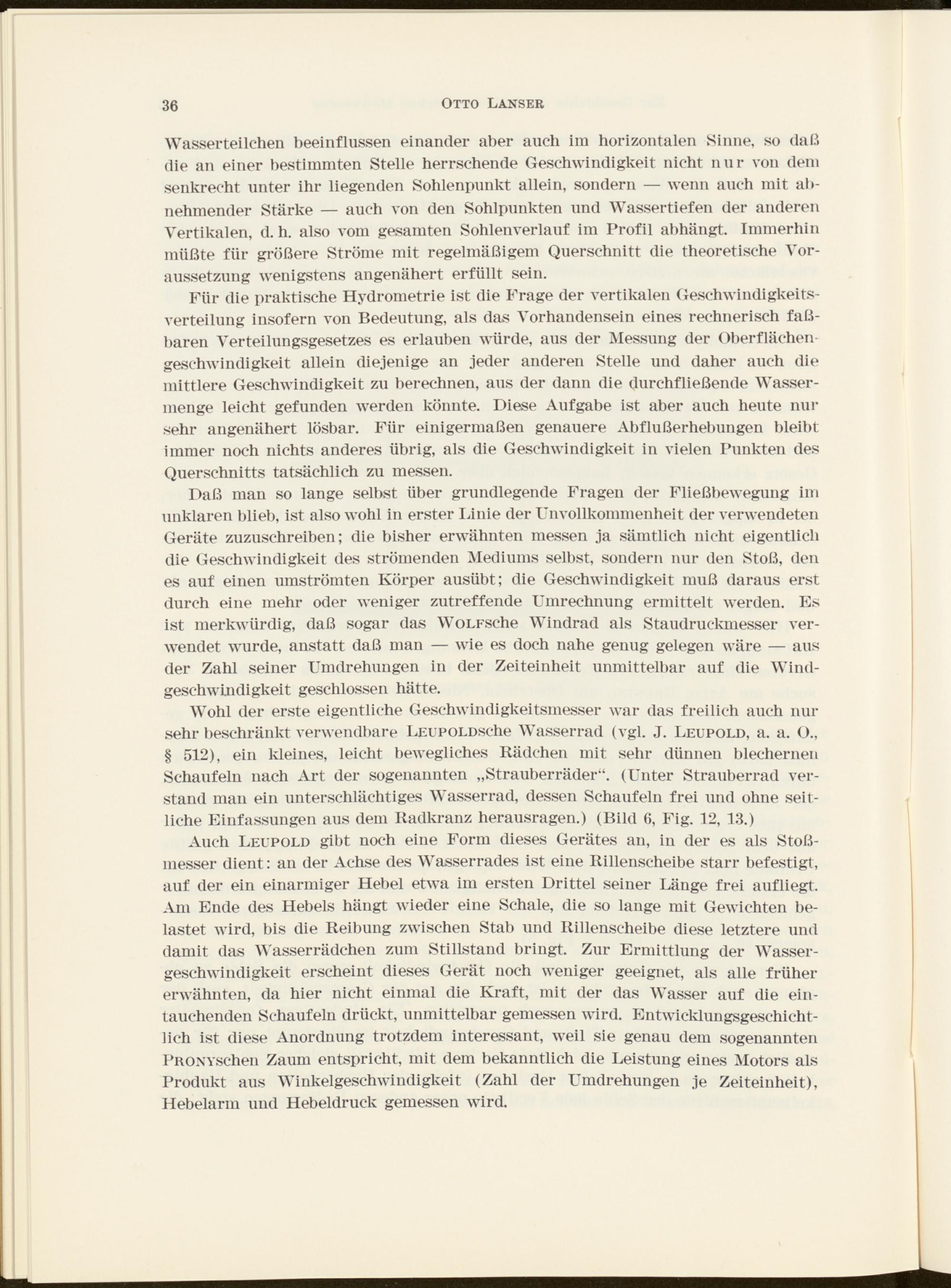 Wohl der erste eigentliche Geschwindigkeitsmesser war das freilich auch nur sehr beschränkt verwendbare LEUPOLDsche Wasserrad (vgl. J. Leupold, a. a. O., § 512), ein kleines, leicht bewegliches Rädchen mit sehr dünnen blechernen Schaufeln nach Art der sogenannten „Strauberräder“. (Unter Strauberrad verstand man ein unterschlächtiges Wasserrad, dessen Schaufeln frei und ohne seitliche Einfassungen aus dem Radkranz herausragen.) (Bild 6, Fig. 12, 13.)