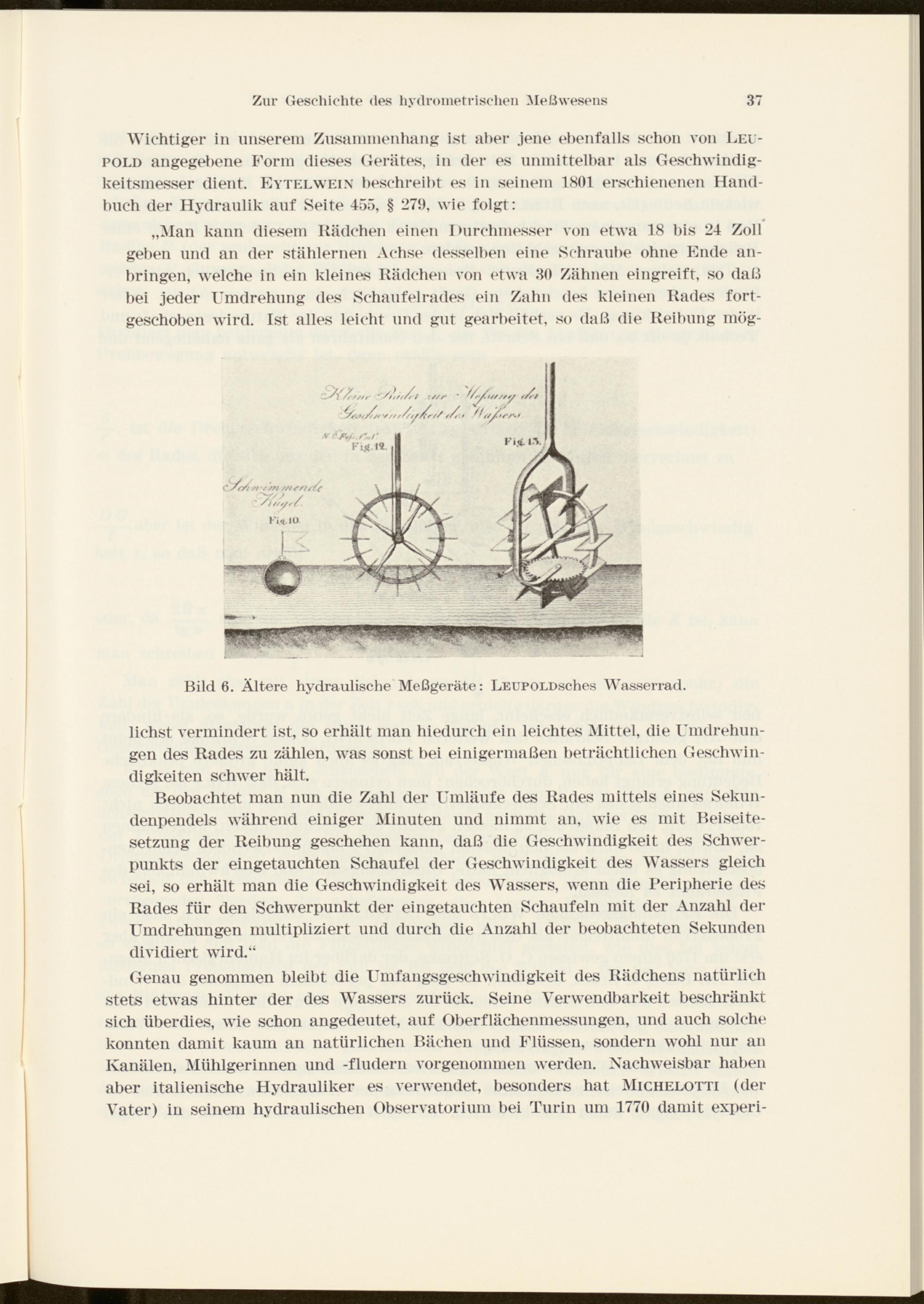Genau genommen bleibt die Umfangsgeschwindigkeit des Rädchens natürlich stets etwas hinter der des Wassers zurück. Seine Verwendbarkeit beschränkt sich überdies, wie schon angedeutet, auf Oberflächenmessungen, und auch solche konnten damit kaum an natürlichen Bächen und Flüssen, sondern wohl nur an Kanälen, Mühlgerinnen und -fludern vorgenommen werden. Nachweisbar haben aber italienische Hydrauliker es verwendet, besonders hat Michelotti (der Vater) in seinem hydraulischen Observatorium bei Turin um 1770 damit experi-