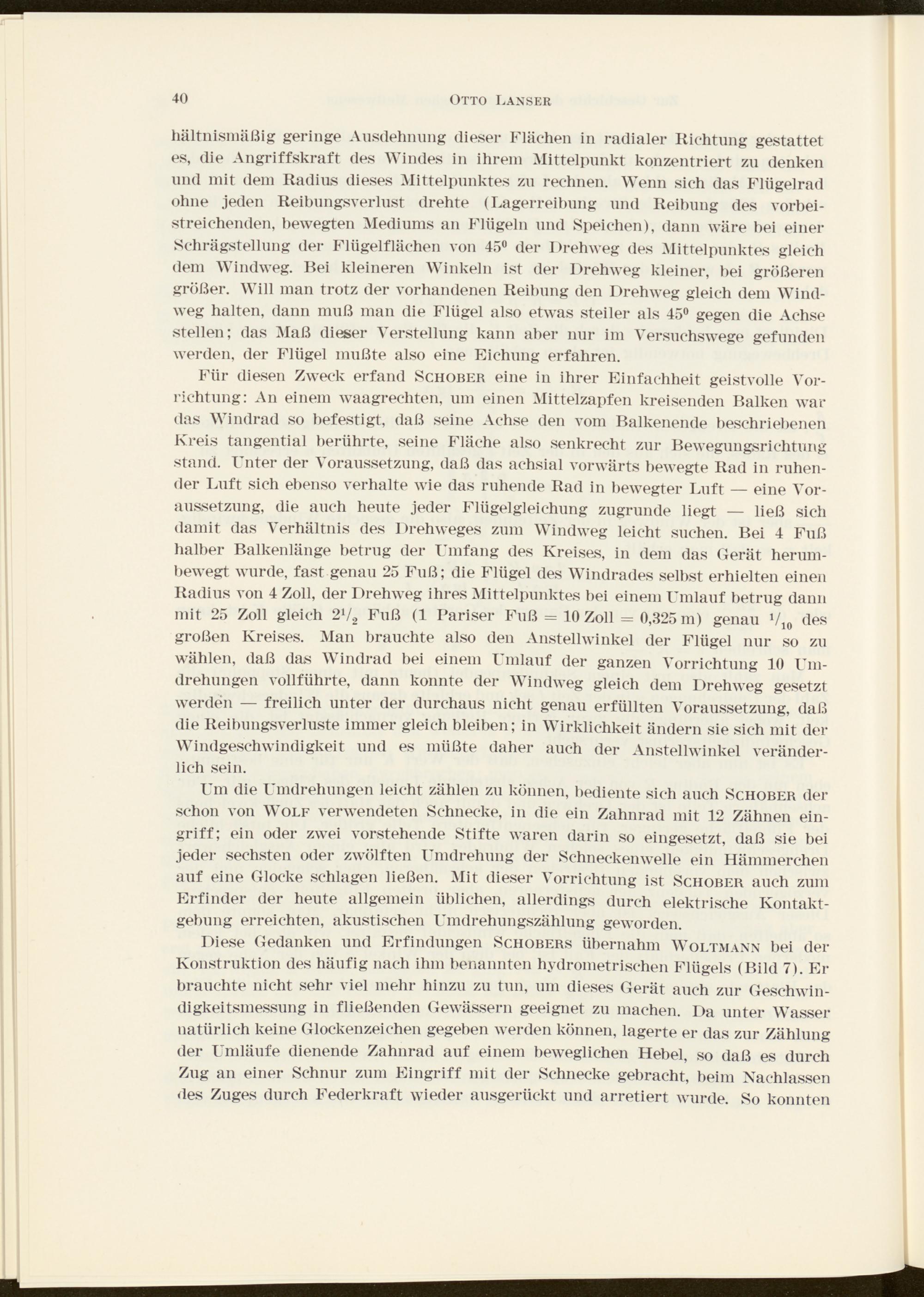 Für diesen Zweck erfand Schober eine in ihrer Einfachheit geistvolle Vorrichtung: An einem waagrechten, um einen Mittelzapfen kreisenden Balken war das Windrad so befestigt, daß seine Achse den vom Balkenende beschriebenen Kreis tangential berührte, seine Fläche also senkrecht zur Bewegungsrichtung stand. Unter der Voraussetzung, daß das achsial vorwärts bewegte Rad in ruhender Luft sich ebenso verhalte wie das ruhende Rad in bewegter Luft — eine Voraussetzung, die auch heute jeder Flügelgleichung zugrunde liegt — ließ sich damit das Verhältnis des Drehweges zum Windweg leicht suchen. Bei 4 Fuß halber Balkenlänge betrug der Umfang des Kreises, in dem das Gerät herumbewegt wurde, fast genau 25 Fuß; die Flügel des Windrades selbst erhielten einen Radius von 4 Zoll, der Drehweg ihres Mittelpunktes bei einem Umlauf betrug dann mit 25 Zoll gleich 2V 2 Fuß (1 Pariser Fuß = 10 Zoll = 0,325 m) genau V 10 des großen Kreises. Man brauchte also den Anstellwinkel der Flügel nur so zu wählen, daß das Windrad bei einem Umlauf der ganzen Vorrichtung 10 Umdrehungen vollführte, dann konnte der Windweg gleich dem Drehweg gesetzt werden — freilich unter der durchaus nicht genau erfüllten Voraussetzung, daß die Reibungsverluste immer gleich bleiben; in Wirklichkeit ändern sie sich mit der Windgeschwindigkeit und es müßte daher auch der Anstellwinkel veränderlich sein.