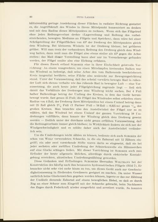 Diese Gedanken und Erfindungen Schobers übernahm Woltmann bei der Konstruktion des häufig nach ihm benannten hydrometrischen Flügels (Bild 7). Er brauchte nicht sehr viel mehr hinzu zu tun, um dieses Gerät auch zur Geschwindigkeitsmessung in fließenden Gewässern geeignet zu machen. Da unter Wasser natürlich keine Glockenzeichen gegeben werden können, lagerte er das zur Zählung der Umläufe dienende Zahnrad auf einem beweglichen Hebel, so daß es durch Zug an einer Schnur zum Eingriff mit der Schnecke gebracht, beim Nachlassen des Zuges durch Federkraft wieder ausgerückt und arretiert wurde. So konnten