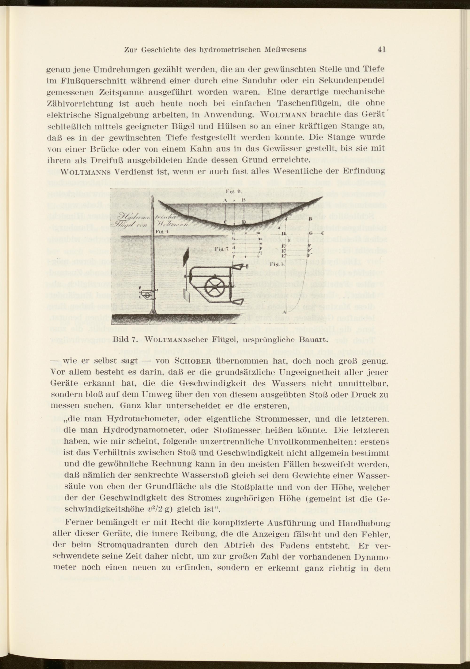 genau jene Umdrehungen gezählt werden, die an der gewünschten Stelle und Tiefe im Flußquerschnitt während einer durch eine Sanduhr oder ein Sekundenpendel gemessenen Zeitspanne ausgeführt worden waren. Eine derartige mechanische Zählvorrichtung ist auch heute noch hei einfachen Taschenflügeln, die ohne elektrische Signalgebung arbeiten, in Anwendung. Woltmann brachte das Gerät schließlich mittels geeigneter Bügel und Hülsen so an einer kräftigen Stange an, daß es in der gewünschten Tiefe festgestellt werden konnte. Die Stange wurde von einer Brücke oder von einem Kahn aus in das Gewässer gestellt, bis sie mit ihrem als Dreifuß ausgebildeten Ende dessen Grund erreichte.