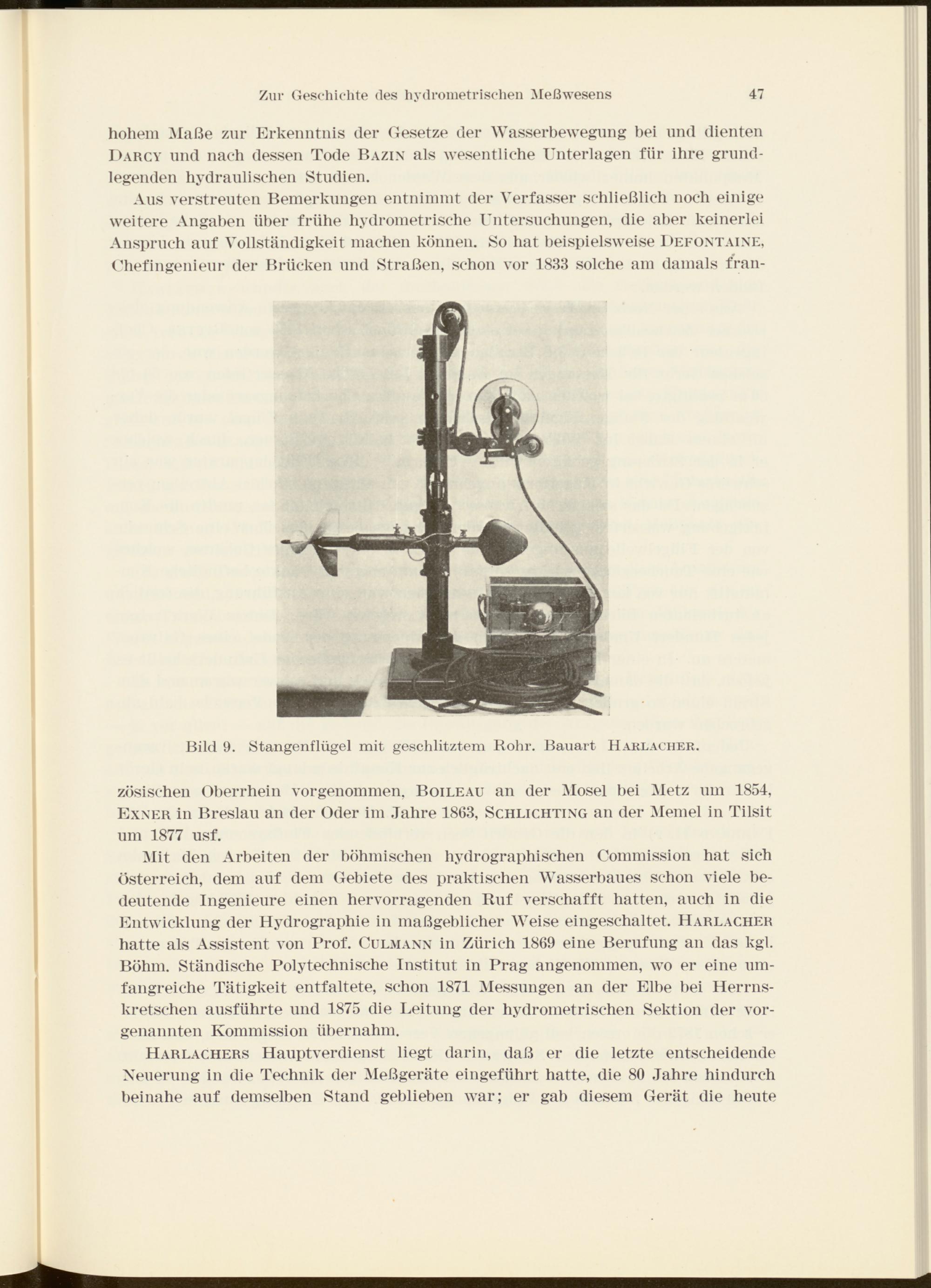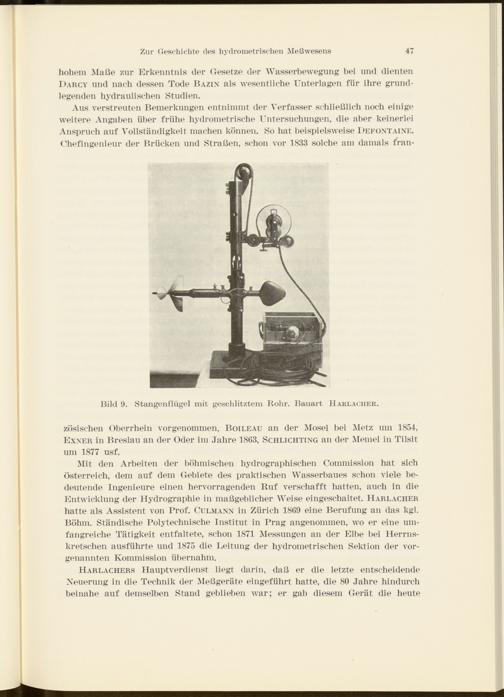 Mit den Arbeiten der böhmischen hydrographischen Commission hat sich Österreich, dem auf dem Gebiete des praktischen Wasserbaues schon viele bedeutende Ingenieure einen hervorragenden Ruf verschafft hatten, auch in die Entwicklung der Hydrographie in maßgeblicher Weise eingeschaltet. Harlacher hatte als Assistent von Prof. Culmann in Zürich 1869 eine Berufung an das kgl. Böhm. Ständische Polytechnische Institut in Prag angenommen, wo er eine umfangreiche Tätigkeit entfaltete, schon 1871 Messungen an der Elbe bei Herrns- kretschen ausführte und 1875 die Leitung der hydrometrischen Sektion der vorgenannten Kommission übernahm.