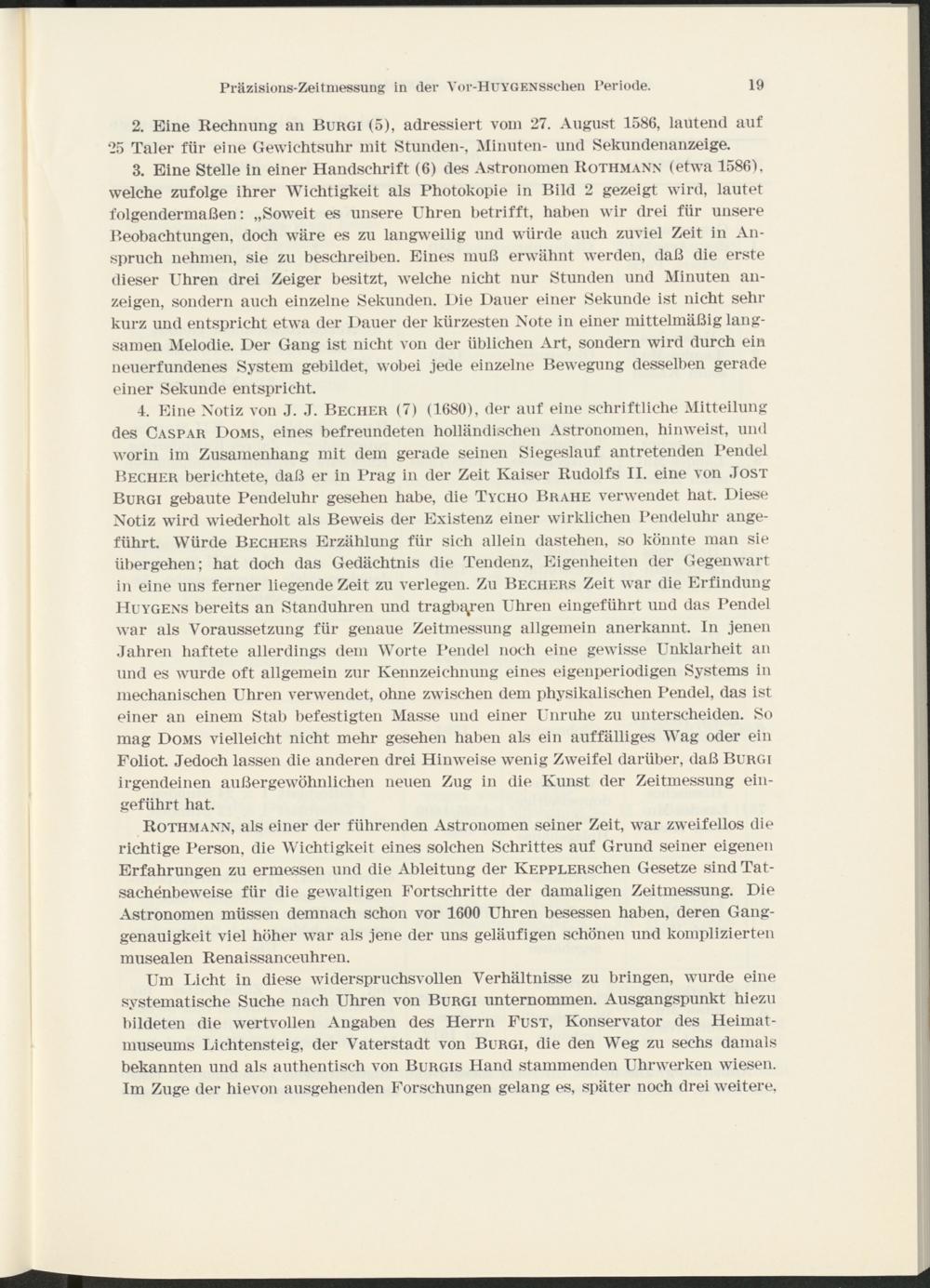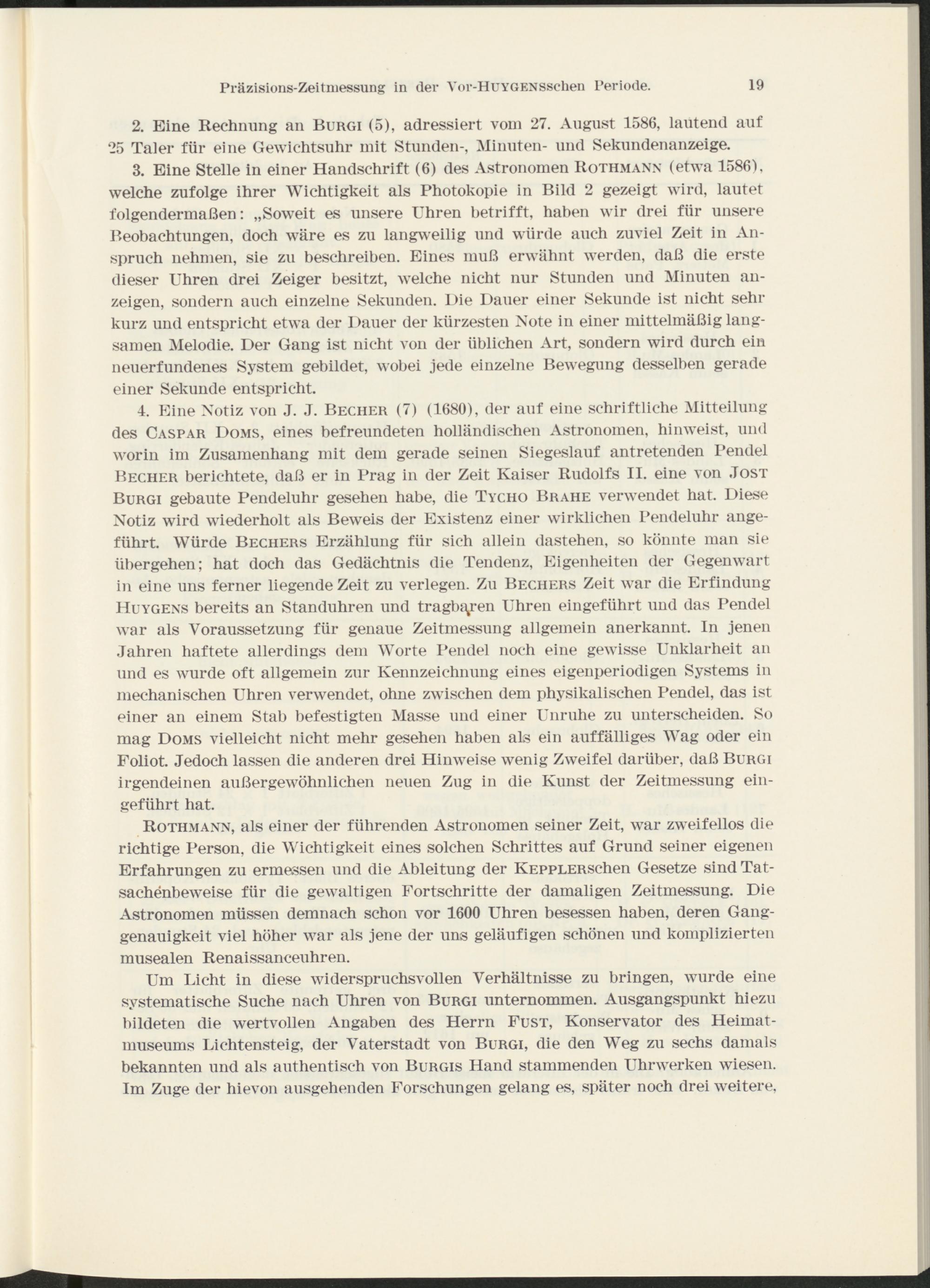 4. Eine Notiz von J. J. Becher (7) (1680), der auf eine schriftliche Mitteilung des Caspar Doms, eines befreundeten holländischen Astronomen, hinweist, und worin im Zusamenhang mit dem gerade seinen Siegeslauf antretenden Pendel Becher berichtete, daß er in Prag in der Zeit Kaiser Rudolfs II. eine von .Tost Burgi gebaute Pendeluhr gesehen habe, die Tycho Brahe verwendet hat. Diese Notiz wird wiederholt als Beweis der Existenz einer wirklichen Pendeluhr angeführt. Würde Bechers Erzählung für sich allein dastehen, so könnte man sie übergehen; hat doch das Gedächtnis die Tendenz, Eigenheiten der Gegenwart in eine uns ferner liegende Zeit zu verlegen. Zu Bechers Zeit war die Erfindung Huygens bereits an Standuhren und tragbaren Uhren eingeführt und das Pendel war als Voraussetzung für genaue Zeitmessung allgemein anerkannt. In jenen Tahren haftete allerdings dem Worte Pendel noch eine gewisse Unklarheit an und es wurde oft allgemein zur Kennzeichnung eines eigenperiodigen Systems in mechanischen Uhren verwendet, ohne zwischen dem physikalischen Pendel, das ist einer an einem Stab befestigten Masse und einer Unruhe zu unterscheiden. So mag Doms vielleicht nicht mehr gesehen haben als ein auffälliges Wag oder ein Foliot. Jedoch lassen die anderen drei Hinweise wenig Zweifel darüber, daß Burgi irgendeinen außergewöhnlichen neuen Zug in die Kunst der Zeitmessung eingeführt hat.