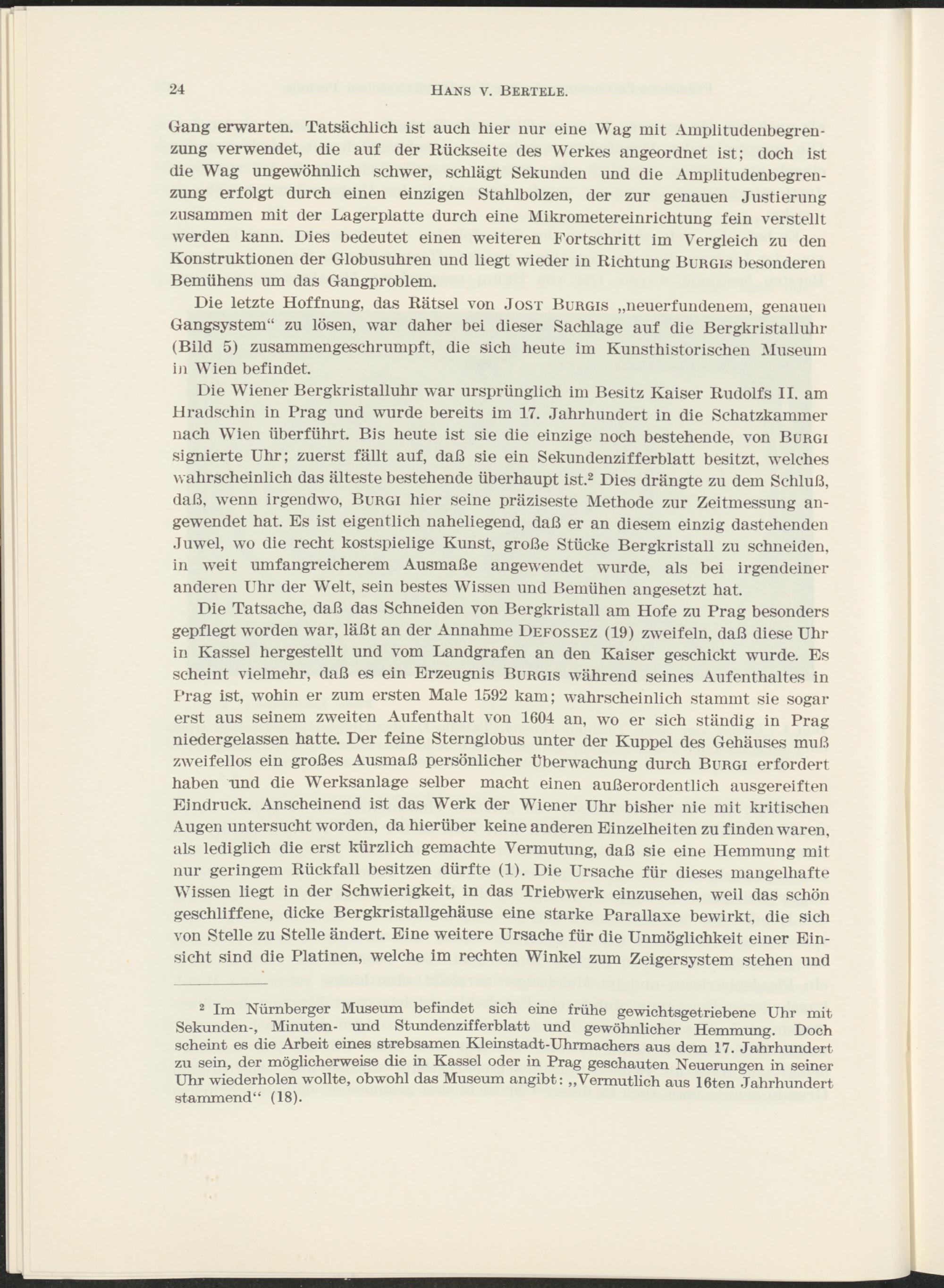 Die Tatsache, daß das Schneiden von Bergkristall am Hofe zu Prag besonders gepflegt worden war, läßt an der Annahme Defossez (19) zweifeln, daß diese Uhr in Kassel hergestellt und vom Landgrafen an den Kaiser geschickt wurde. Es scheint vielmehr, daß es ein Erzeugnis Burgis während seines Aufenthaltes in Prag ist, wohin er zum ersten Male 1592 kam; wahrscheinlich stammt sie sogar erst aus seinem zweiten Aufenthalt von 1604 an, wo er sich ständig in Prag niedergelassen hatte. Der feine Sternglobus unter der Kuppel des Gehäuses muß zweifellos ein großes Ausmaß persönlicher Überwachung durch Burgi erfordert haben nnd die Werksanlage selber macht einen außerordentlich ausgereiften Eindruck. Anscheinend ist das Werk der Wiener Uhr bisher nie mit kritischen Augen untersucht worden, da hierüber keine anderen Einzelheiten zu finden waren, als lediglich die erst kürzlich gemachte Vermutung, daß sie eine Hemmung mit nur geringem Rückfall besitzen dürfte (1). Die Ursache für dieses mangelhafte Wissen liegt in der Schwierigkeit, in das Triebwerk einzusehen, weil das schön geschliffene, dicke Bergkristallgehäuse eine starke Parallaxe bewirkt, die sich von Stelle zu Stelle ändert. Eine weitere Ursache für die Unmöglichkeit einer Einsicht sind die Platinen, welche im rechten Winkel zum Zeigersystem stehen und