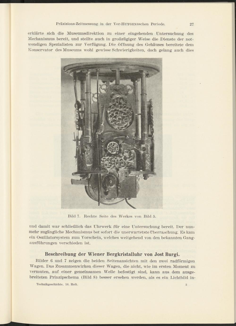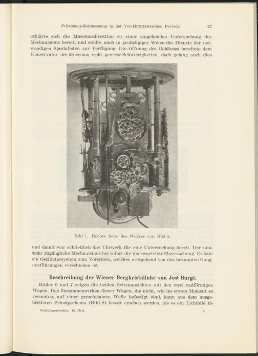 und damit war schließlich das Uhrwerk für eine Untersuchung bereit. Der nunmehr zugängliche Mechanismus bot sofort die unerwartetste Überraschung. Es kam ein Oszillatorsystem zum Vorschein, welches weitgehend von den bekannten Gang- ausführungen verschieden ist.