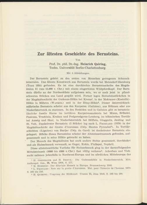 Der Bernstein gehört zu den ersten von Menschen getragenen Schmuckmineralen. Das älteste Kunstwerk aus Bernstein wurde bei Meiendorf-Hamburg (Tode 1934) gefunden. Es ist eine durchlochte Bernsteinscheibe des Magda- lönien II (um 11.000 v. Chr.) mit einem eingeritzten Wildpferdkopf. Der Bernstein dürfte an der Nordseeküste aufgelesen sein, wo er noch jetzt in pfundschweren Stücken ans Land gespült wird. Ferner lagen Bernsteinstückchen in der Magdalönschicht der Gudenus-Höhle hei Krems 1 , in der Mokrauer-( Kostelik )- Höhle in Mähren (Wankel) und in der Zitny-Höhle 2 . Dieser österreichischmährische Bernstein scheint aus den Karpaten (Galizien), aus Böhmen oder aus Niederösterreich zu stammen. In den Beskiden und in Galizien gibt es bernsteinähnliche fossile Harze im tertiären Karpatensandstein bei Mizun, Bründel, Pasicsza, Trzebinia, Krakau und Podgorodgyrze-Lemberg, im böhmischen Tertiär bei Aussig und Skuc, in Niederösterreich bei Höflein, Gloggnitz, Jauling und St. Veit. Dunkelroter Bernstein (5 Stücke) lag nach L. Frossard (1870) in der Magdalönschicht der Grotte d’Auressan (Döp. Hautes Pyrenees 3 ). In Tertiärschichten (Ligniten) von Barjac (Dep. du Gard) ist dunkelroter Bernstein eingelagert. Stücke dieses Bernsteins scheint der Altsteinzeitmensch gefunden, aufgesammelt und in seine Höhle gebracht zu haben.