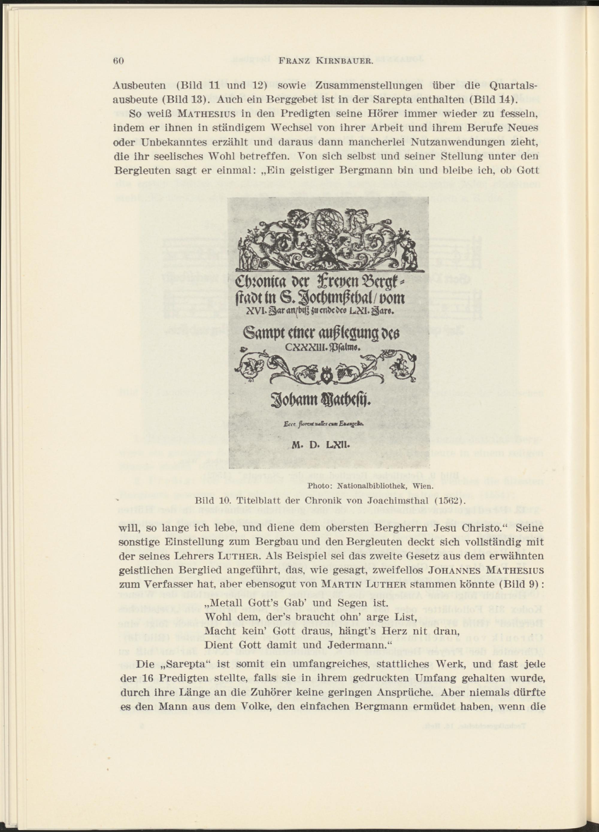 will, so lange ich lebe, und diene dem obersten Bergherrn Jesu Christo.“ Seine sonstige Einstellung zum Bergbau und den Bergleuten deckt sich vollständig mit der seines Lehrers Luther. Als Beispiel sei das zweite Gesetz aus dem erwähnten geistlichen Berglied angeführt, das, wie gesagt, zweifellos Johannes Mathesius zum Verfasser hat, aber ebensogut von Martin Luther stammen könnte (Bild 9):