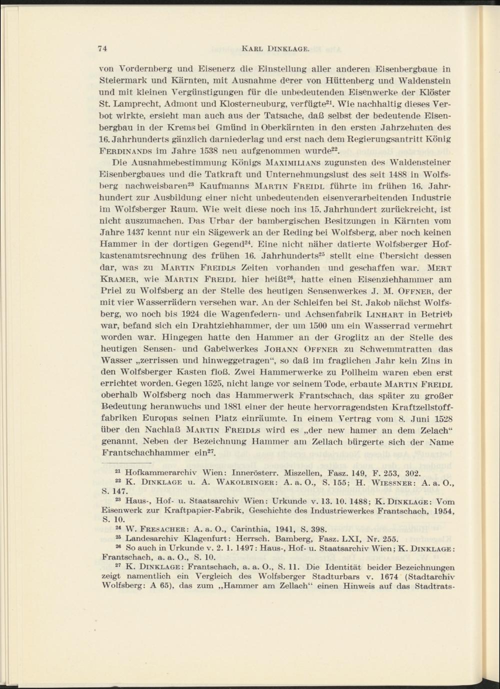 Die Ausnahmebestimmung Königs Maximilians zugunsten des Waldensteiner Eisenbergbaues und die Tatkraft und Unternehmungslust des seit 1488 in Wolfsberg nachweisbaren 23 Kaufmanns Martin Freidl führte im frühen 16. Jahrhundert zur Ausbildung einer nicht unbedeutenden eisenverarbeitenden Industrie im Wolfsberger Raum. Wie weit diese noch ins 15. Jahrhundert zurückreicht, ist nicht auszumachen. Das Urbar der bambergischen Besitzungen in Kärnten vom Jahre 1437 kennt nur ein Sägewerk an der Reding hei Wolfsberg, aber noch keinen Hammer in der dortigen Gegend 24 . Eine nicht näher datierte Wolfsberger Hofkastenamtsrechnung des frühen 16. Jahrhunderts 25 stellt eine Übersicht dessen dar, was zu Martin Freidls Zeiten vorhanden und geschaffen war. Mert Kramer, wie Martin Freidl hier heißt 26 , hatte einen Eisenziehhammer am Priel zu Wolfsberg an der Stelle des heutigen Sensenwerkes J. M. Offner, der mit vier Wasserrädern versehen war. An der Schleifen bei St. Jakob nächst Wolfsberg, wo noch his 1924 die Wagenfedern- und Achsenfabrik Linhart in Betrieb war, befand sich ein Drahtziehhammer, der um 1500 um ein Wasserrad vermehrt worden war. Hingegen hatte den Hammer an der Groglitz an der Stelle des heutigen Sensen- und Gabelwerkes Johann Offner zu Schwemmt ratten das Wasser „zerrissen und hinweggetragen“, so daß im fraglichen Jahr kein Zins in den Wolfsberger Kasten floß. Zwei Hammerwerke zu Pollheini waren eben erst errichtet worden. Gegen 1525, nicht lange vor seinem Tode, erbaute Martin Freidl oberhalb Wolfsberg noch das Hammerwerk Frantschach, das später zu großer Bedeutung heranwuchs und 1881 einer der heute hervorragendsten Kraftzellstofffabriken Europas seinen Platz einräumte. In einem Vertrag vom 8. Juni 1528 über den Nachlaß Martin Freidls wird es „der new hamer an dem Zelach“ genannt. Neben der Bezeichnung Hammer am Zellach bürgerte sich der Name Frantschachhammer ein 27 .