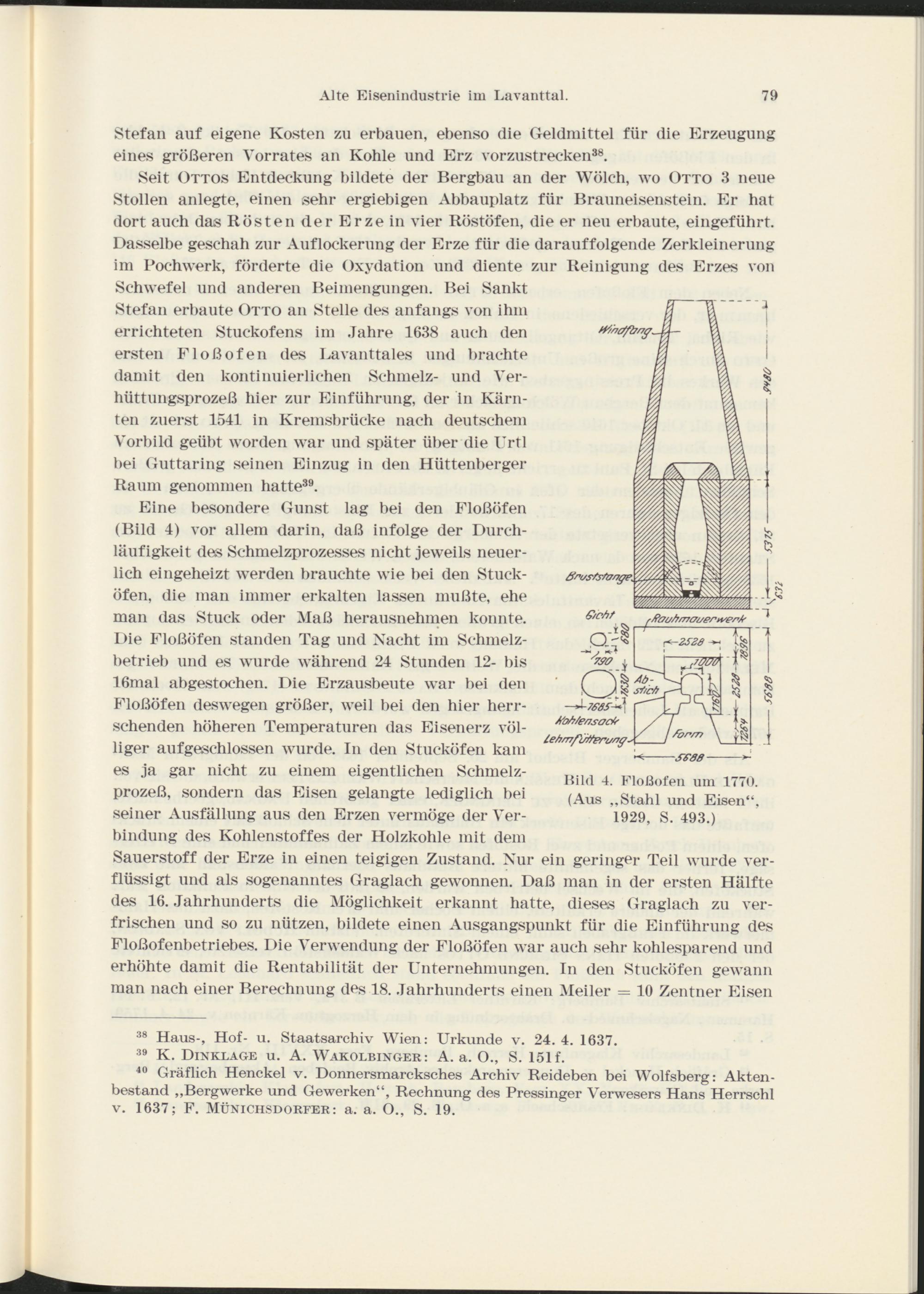 Seit Ottos Entdeckung bildete der Bergbau an der Wölch, wo Otto 3 neue Stollen anlegte, einen sehr ergiebigen Abbauplatz für Brauneisenstein. Er hat dort auch das Rösten der Erze in vier Röstöfen, die er neu erbaute, eingeführt. Dasselbe geschah zur Auflockerung der Erze für die darauffolgende Zerkleinerung im Pochwerk, förderte die Oxydation und diente zur Reinigung des Erzes von Schwefel und anderen Beimengungen. Bei Sankt Stefan erbaute Otto an Stelle des anfangs von ihm errichteten Stuckofens im Jahre 1638 auch den ersten Floßofen des Lavanttales und brachte damit den kontinuierlichen Schmelz- und Verhüttungsprozeß hier zur Einführung, der in Kärnten zuerst 1541 in Kremsbrücke nach deutschem Vorbild geübt worden war und später über die Urtl bei Guttaring seinen Einzug in den Hüttenberger Raum genommen hatte 39 .
