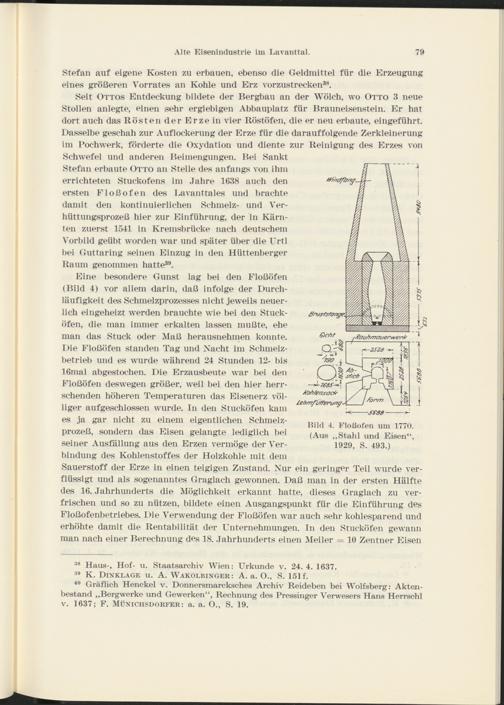Eine besondere Gunst lag bei den Floßöfen (Bild 4) vor allem darin, daß infolge der Durch- läufigkeit das Schmelzprozesses nicht jeweils neuerlich eingeheizt werden brauchte wie bei den Stucköfen, die man immer erkalten lassen mußte, ehe man das Stuck oder Maß herausnehmen konnte.