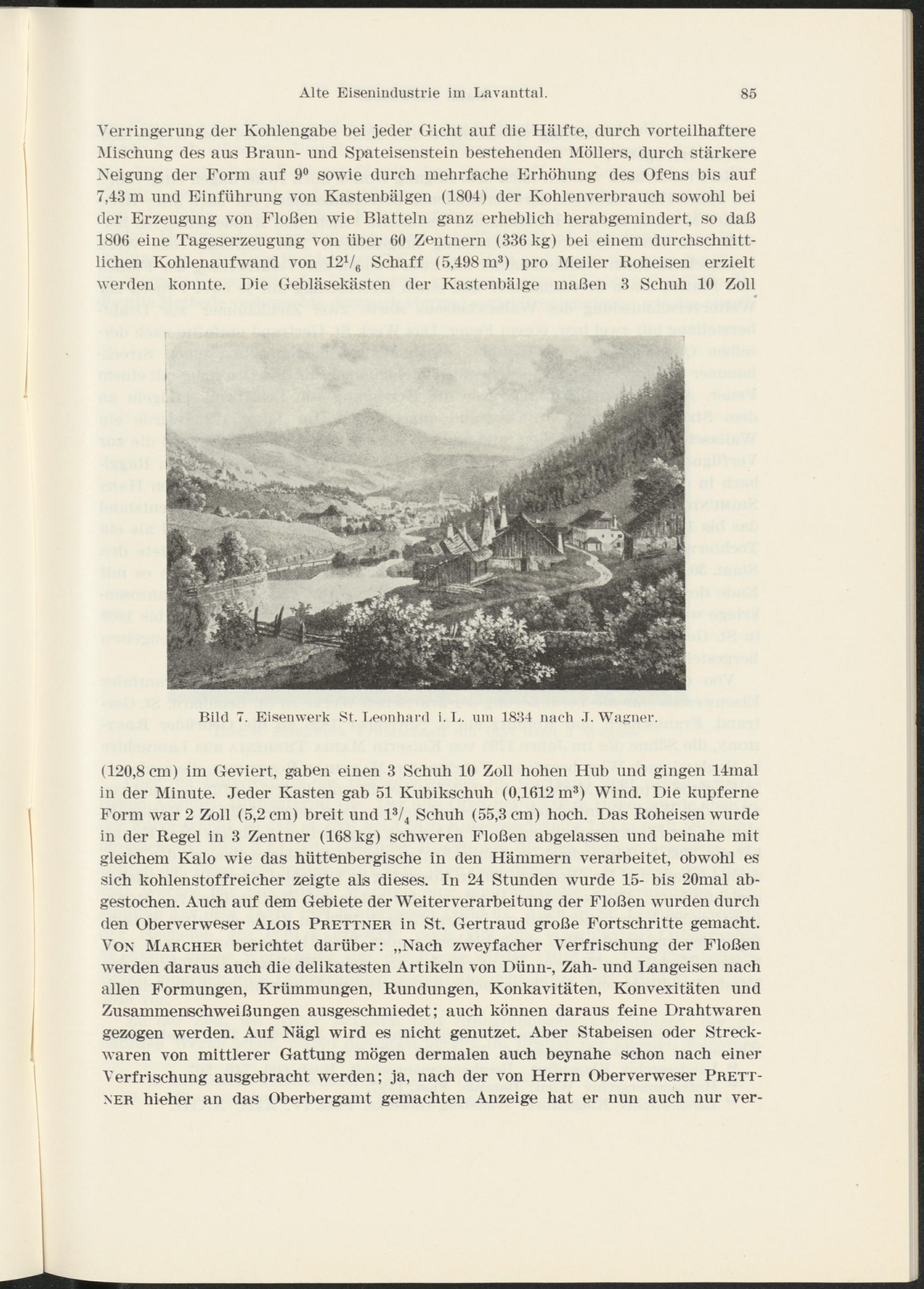 (120,8 cm) im Geviert, gaben einen 3 Schuh 10 Zoll hohen Hub und gingen 14mal in der Minute. Jeder Kasten gab 51 Kubikschuh (0,1612 m 3 ) Wind. Die kupferne Form war 2 Zoll (5,2 cm) breit und l 3 / 4 Schuh (55,3 cm) hoch. Das Roheisen wurde in der Regel in 3 Zentner (168 kg) schweren Flößen abgelassen und beinahe mit gleichem Kalo wie das hüttenb er gische in den Hämmern verarbeitet, obwohl es sich kohlenstoffreicher zeigte als dieses. In 24 Stunden wurde 15- bis 20mal abgestochen. Auch auf dem Gebiete der Weiterverarbeitung der Flößen wurden durch den Oberverweser Alois Prettner in St. Gertraud große Fortschritte gemacht. Von Marcher berichtet darüber: „Nach zweyfacher Verfrischung der Flößen werden daraus auch die delikatesten Artikeln von Dünn-, Zah- und Langeisen nach allen Formungen, Krümmungen, Rundungen, Konkavitäten, Konvexitäten und Zusammenschweißungen ausgeschmiedet; auch können daraus feine Drahtwaren gezogen werden. Auf Nägl wird es nicht genutzet. Aber Stabeisen oder Streckwaren von mittlerer Gattung mögen dermalen auch beynahe schon nach einer Verfrischung ausgebracht werden; ja, nach der von Herrn Oberverweser Prettner hieher an das Oberbergamt gemachten Anzeige hat er nun auch nur ver-