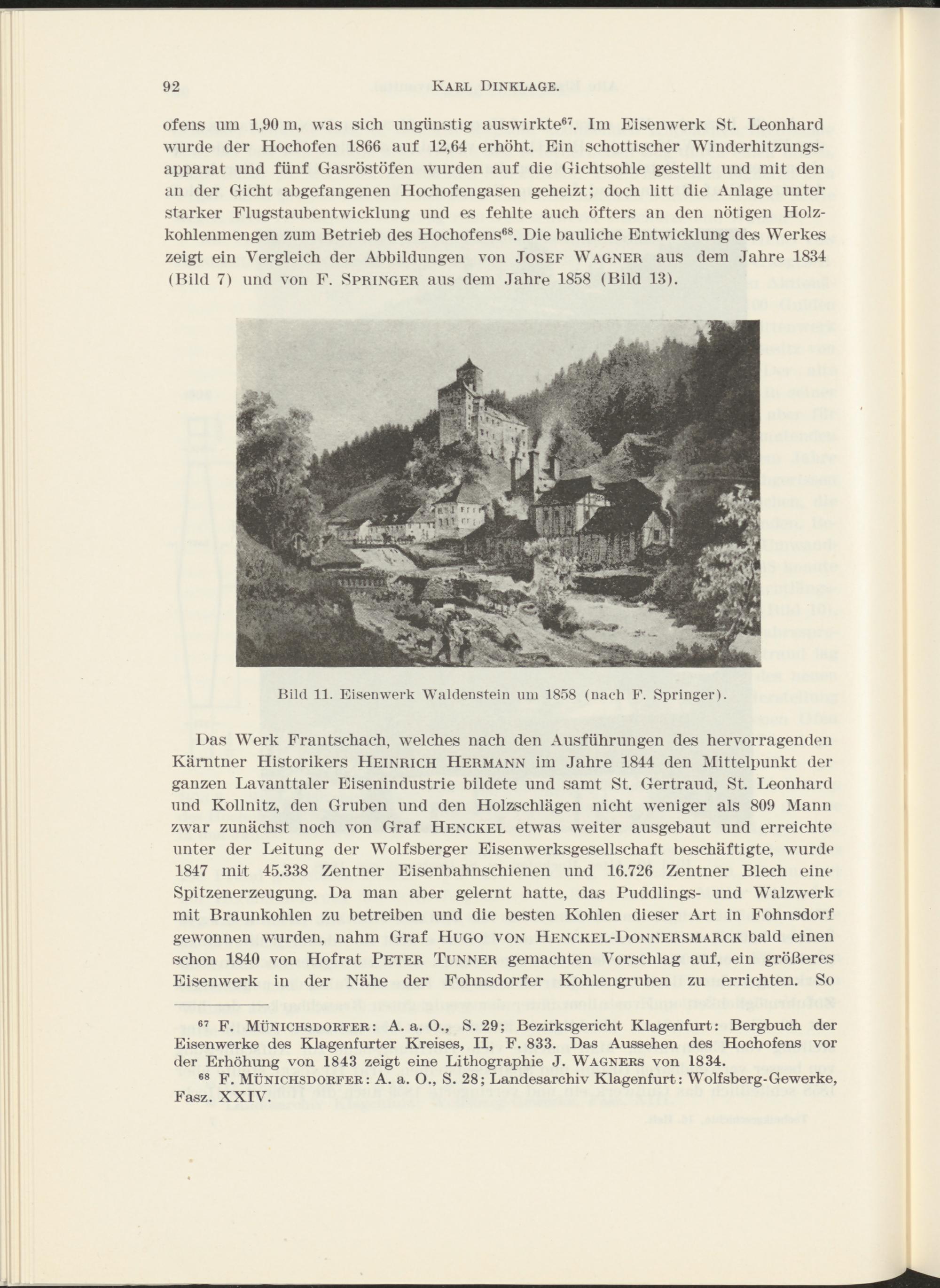 67 F. MünichsDÖRFER : A. a. O., S. 29; Bezirksgericht Klagenfurt: Bergbuch der Eisenwerke des Klagenfurter Kreises, II, F. 833. Das Aussehen des Hochofens vor der Erhöhung von 1843 zeigt eine Lithographie J. Wagners von 1834.