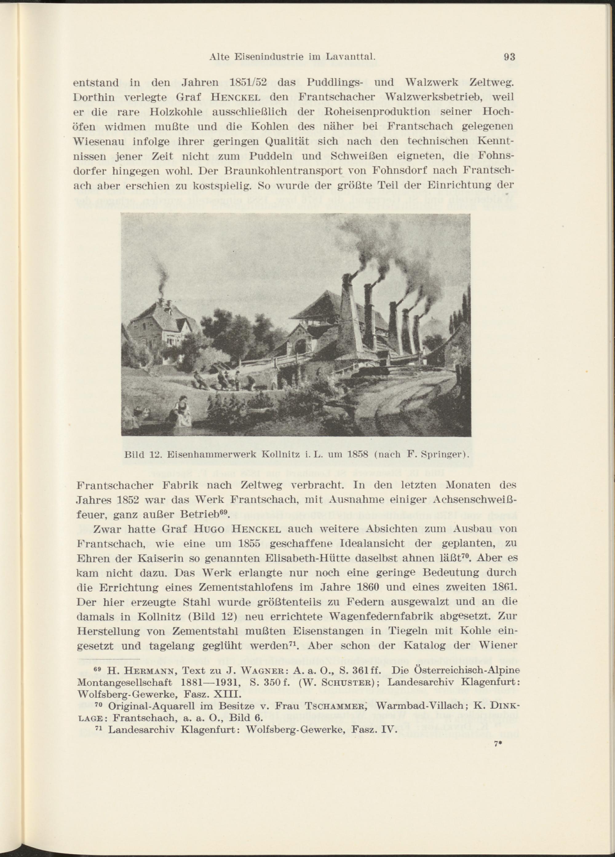 Zwar hatte Graf Hugo Henckel auch weitere Absichten zum Ausbau von Frantschach, wie eine um 1855 geschaffene Idealansicht der geplanten, zu Ehren der Kaiserin so genannten Elisabeth-Hütte daselbst ahnen läßt 70 . Aber es kam nicht dazu. Das Werk erlangte nur noch eine geringe Bedeutung durch die Errichtung eines Zementstahlofens im Jahre 1860 und eines zweiten 1861. Der hier erzeugte Stahl wurde größtenteils zu Federn ausgewalzt und an die damals in Kollnitz (Bild 12) neu errichtete Wagenfedernfabrik abgesetzt. Zur Herstellung von Zementstahl mußten Eisenstangen in Tiegeln mit Kohle eingesetzt und tagelang geglüht werden 71 . Aber schon der Katalog der Wiener