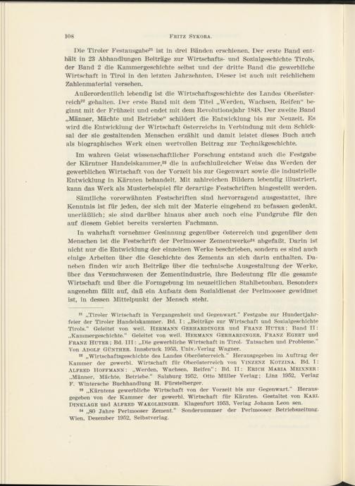 21 „Tiroler Wirtschaft in Vergangenheit und Gegenwart.“ Festgabe zur Hundertjahrfeier der Tiroler Handelskammer. Bd. I: „Beiträge zur Wirtschaft und Sozialgeschichte Tirols.“ Geleitet von weil. Hermann Gerhardinger und Franz Hüter ; Band II: „Kammergeschichte.“ Geleitet von weil. Hermann Gerhardinger, Franz Egert und Franz Hüter; Bd. III: „Die gewerbliche Wirtschaft in Tirol. Tatsachen und Probleme.“ Von Adolf Günther. Innsbruck 1953, Univ.-Verlag Wagner.