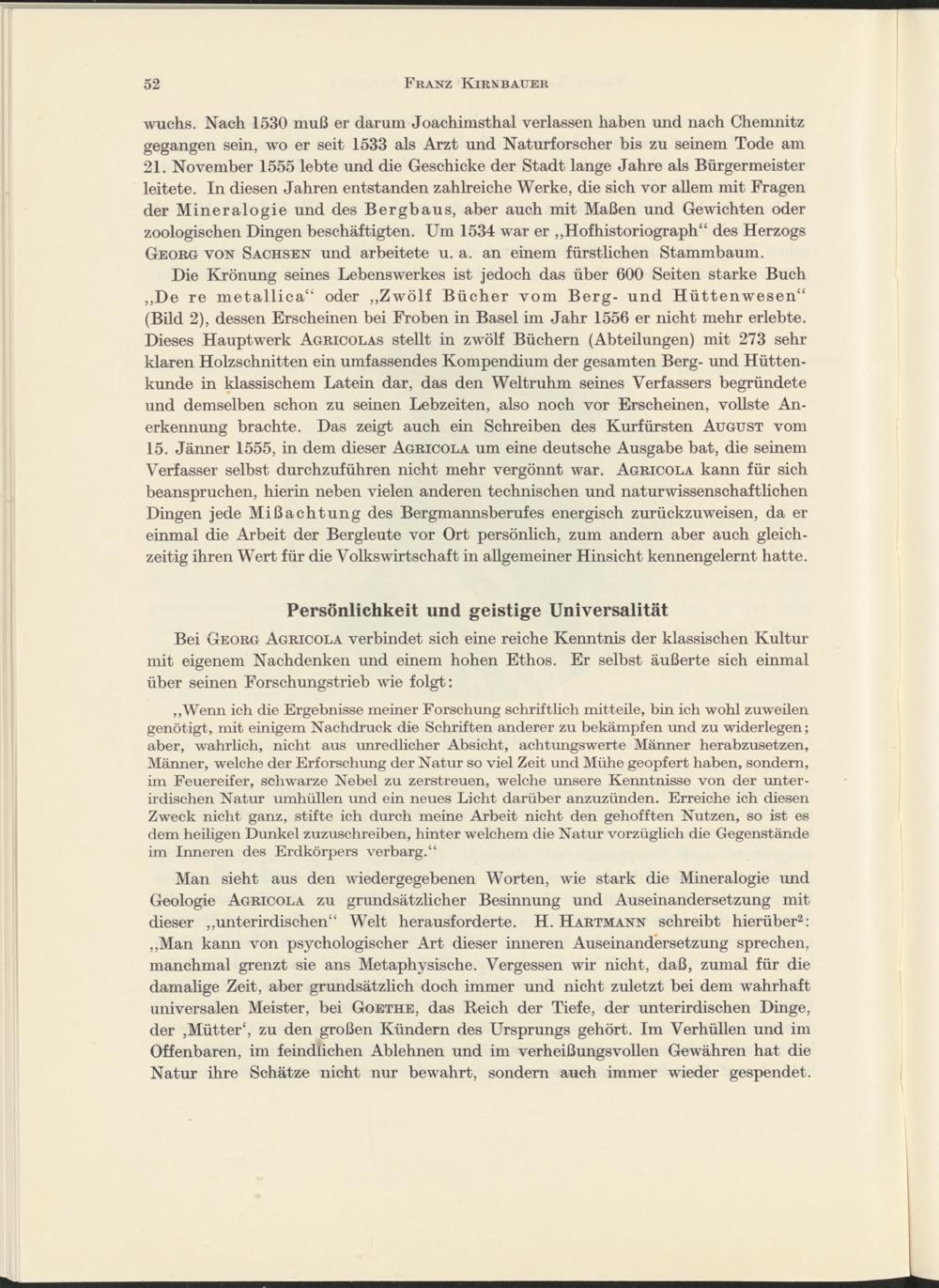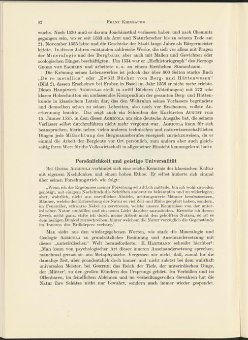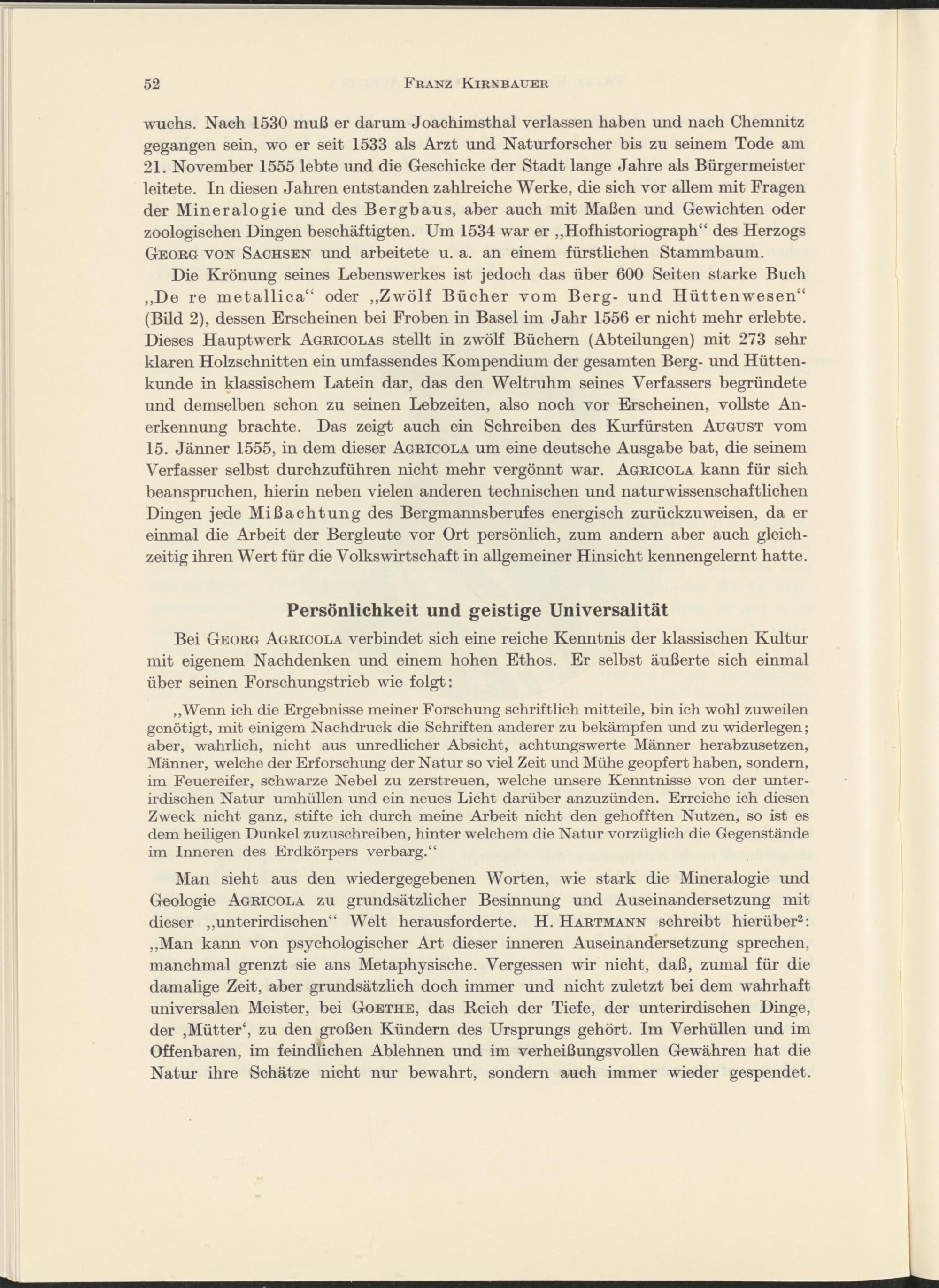 Man sieht aus den wiedergegebenen Worten, wie stark die Mineralogie und Geologie Agricola zu grundsätzlicher Besinnung und Auseinandersetzung mit dieser „unterirdischen“ Welt herausforderte. H. Hartmann schreibt hierüber 2 : „Man kann von psychologischer Art dieser inneren Auseinandersetzung sprechen, manchmal grenzt sie ans Metaphysische. Vergessen wir nicht, daß, zumal für die damalige Zeit, aber grundsätzlich doch immer und nicht zuletzt bei dem wahrhaft universalen Meister, bei Goethe, das Reich der Tiefe, der unterirdischen Dinge, der ,Mütter', zu den großen Kündern des Ursprungs gehört. Im Verhüllen und im Offenbaren, im feindlichen Ablehnen und im verheißungsvollen Gewähren hat die Natur ihre Schätze nicht nur bewahrt, sondern auch immer wieder gespendet.