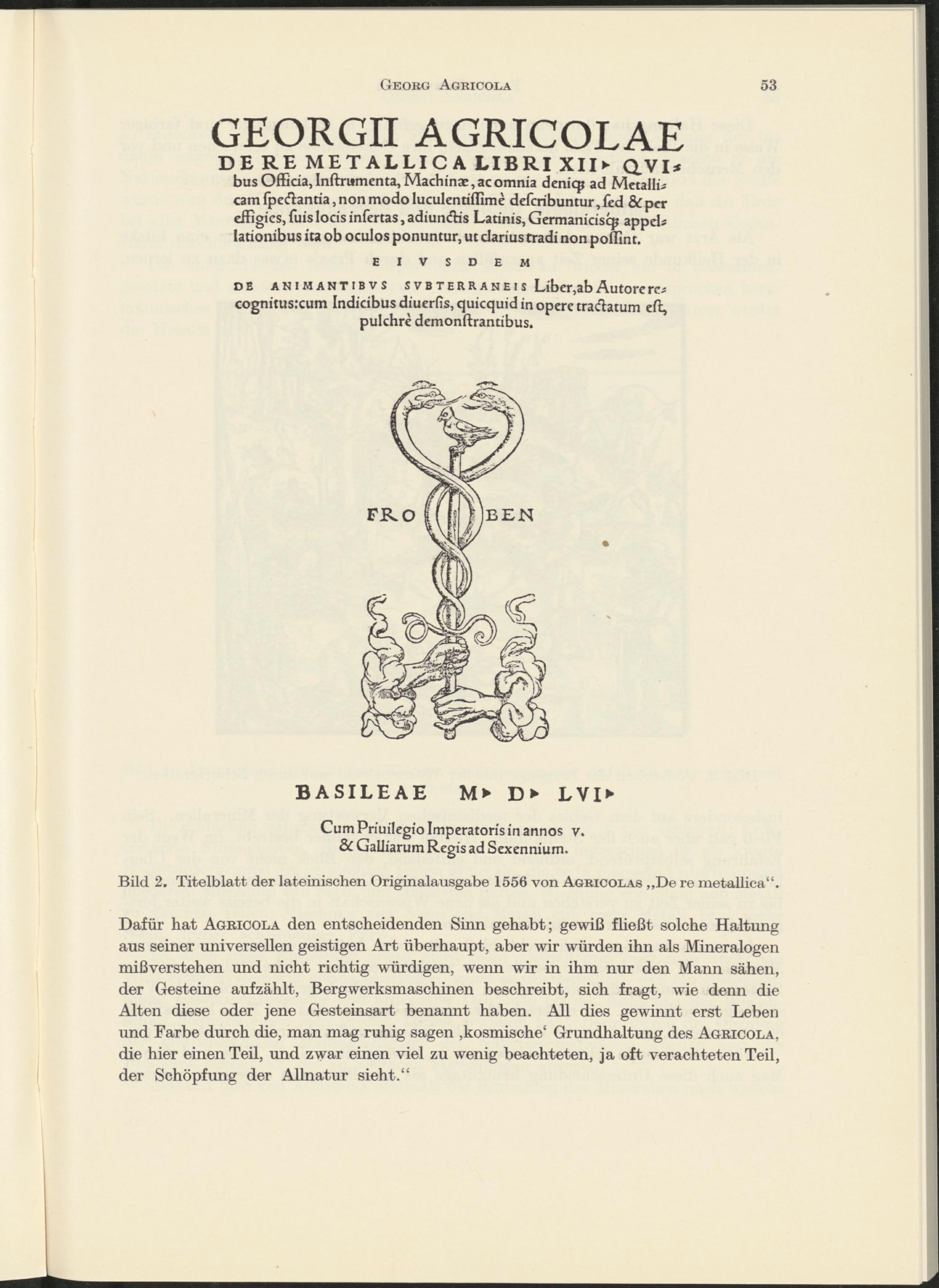 Dafür hat Agricola den entscheidenden Sinn gehabt; gewiß fließt solche Haltung aus seiner universellen geistigen Art überhaupt, aber wir würden ihn als Mineralogen mißverstehen und nicht richtig würdigen, wenn wir in ihm nur den Mann sähen, der Gesteine aufzählt, Bergwerksmaschinen beschreibt, sich fragt, wie denn die Alten diese oder jene Gesteinsart benannt haben. All dies gewinnt erst Leben und Farbe durch die, man mag ruhig sagen ,kosmische 4 Grundhaltung des Agricola, die hier einen Teil, und zwar einen viel zu wenig beachteten, ja oft verachteten Teil, der Schöpfung der Allnatur sieht.“