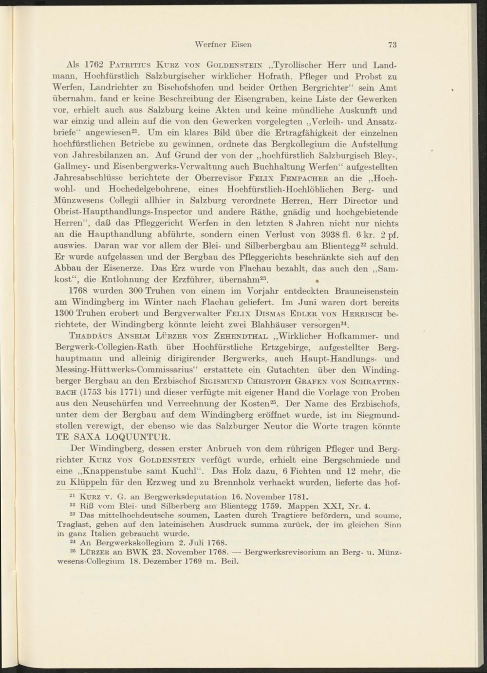 Thaddäus Anselm Lürzer von Zehendthal „Wirklicher Hofkammer- und Bergwerk-Collegien-Rath über Hochfürstliche Ertzgebirge, aufgestellter Berghauptmann und alleinig dirigirender Bergwerks, auch Haupt-Handlungs- und Messing-Hüttwerks-Commissarius“ erstattete ein Gutachten über den Winding- berger Bergbau an den Erzbischof Sigismund Christoph Grafen von Schratten- bach (1753 bis 1771) und dieser verfügte mit eigener Hand die Vorlage von Proben aus den Neuschürfen und Verrechnung der Kosten 25 . Der Name des Erzbischofs, unter dem der Bergbau auf dem Windingberg eröffnet wurde, ist im Siegmundstollen verewigt, der ebenso wie das Salzburger Neutor die Worte tragen könnte TE SANA LOQUUNTUR.