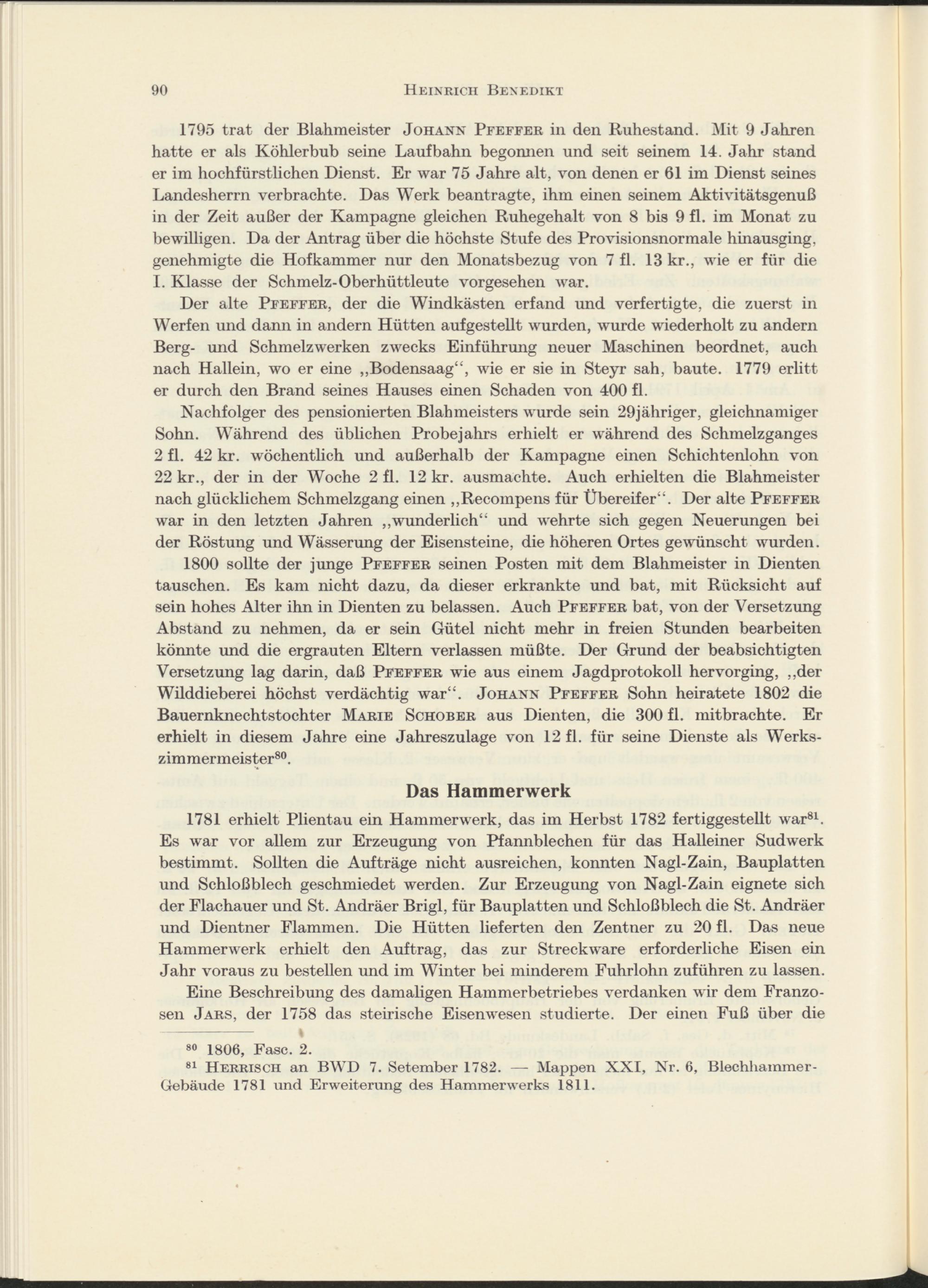 1781 erhielt Plientau ein Hammerwerk, das im Herbst 1782 fertiggestellt war 81 . Es war vor allem zur Erzeugung von Pfannblechen für das Halleiner Sudwerk bestimmt. Sollten die Aufträge nicht ausreichen, konnten Nagl-Zain, Bauplatten und Schloßblech geschmiedet werden. Zur Erzeugung von Nagl-Zain eignete sich der Flachauer und St. Andräer Brigl, für Bauplatten und Schloßblech die St. Andräer und Dientner Flammen. Die Hütten lieferten den Zentner zu 20 fl. Das neue Hammerwerk erhielt den Auftrag, das zur Streckware erforderliche Eisen ein Jahr voraus zu bestellen und im Winter bei minderem Fuhrlohn zuführen zu lassen.