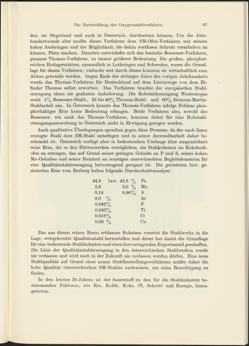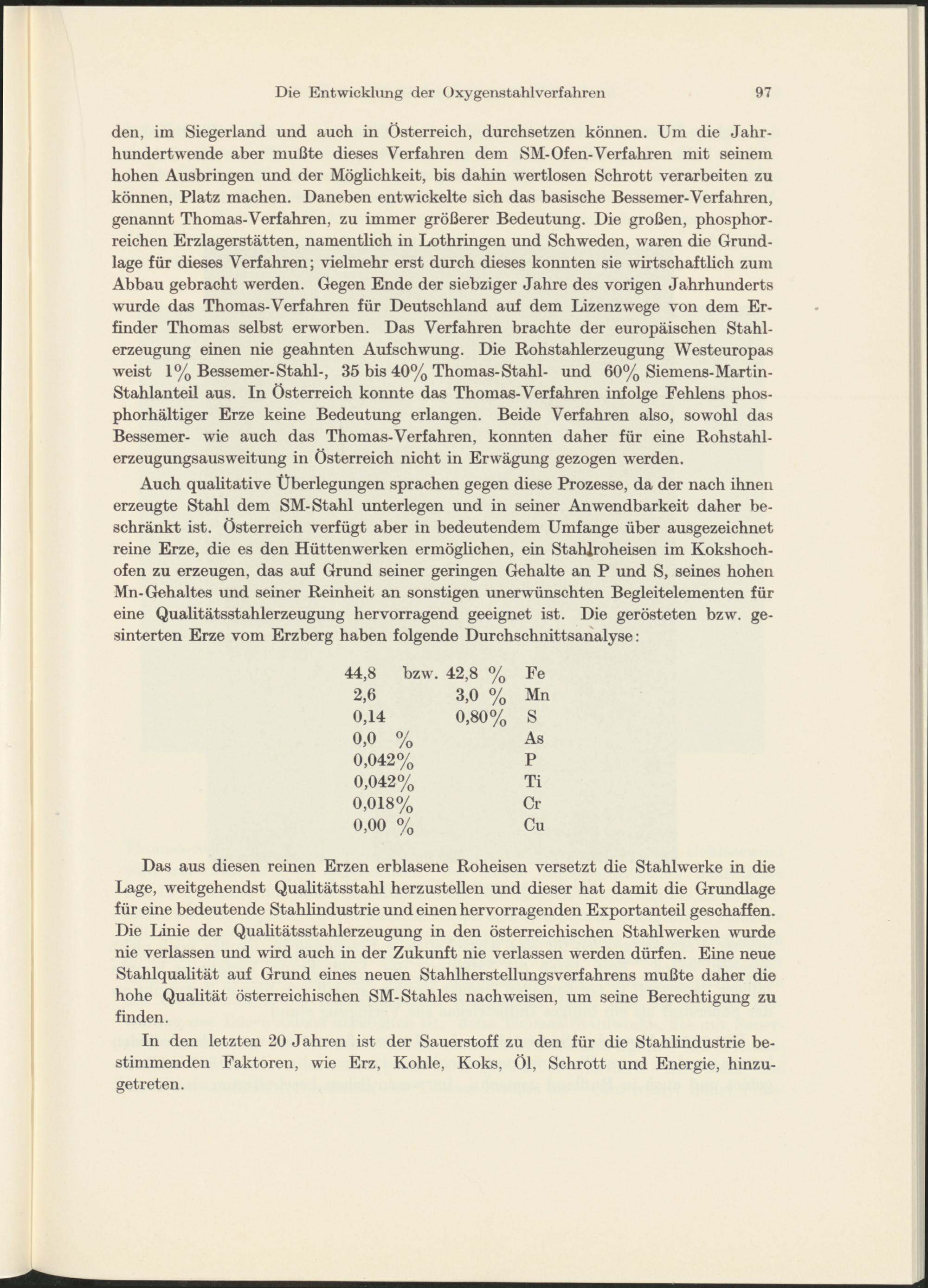 Auch qualitative Überlegungen sprachen gegen diese Prozesse, da der nach ihnen erzeugte Stahl dem SM-Stahl unterlegen und in seiner Anwendbarkeit daher beschränkt ist. Österreich verfügt aber in bedeutendem Umfange über ausgezeichnet reine Erze, die es den Hüttenwerken ermöglichen, ein Stahlroheisen im Kokshochofen zu erzeugen, das auf Grund seiner geringen Gehalte an P und S, seines hohen Mn-Gehaltes und seiner Reinheit an sonstigen unerwünschten Begleitelementen für eine Qualitätsstahlerzeugung hervorragend geeignet ist. Die gerösteten bzw. gesinterten Erze vom Erzberg haben folgende Durchschnittsanalyse:
