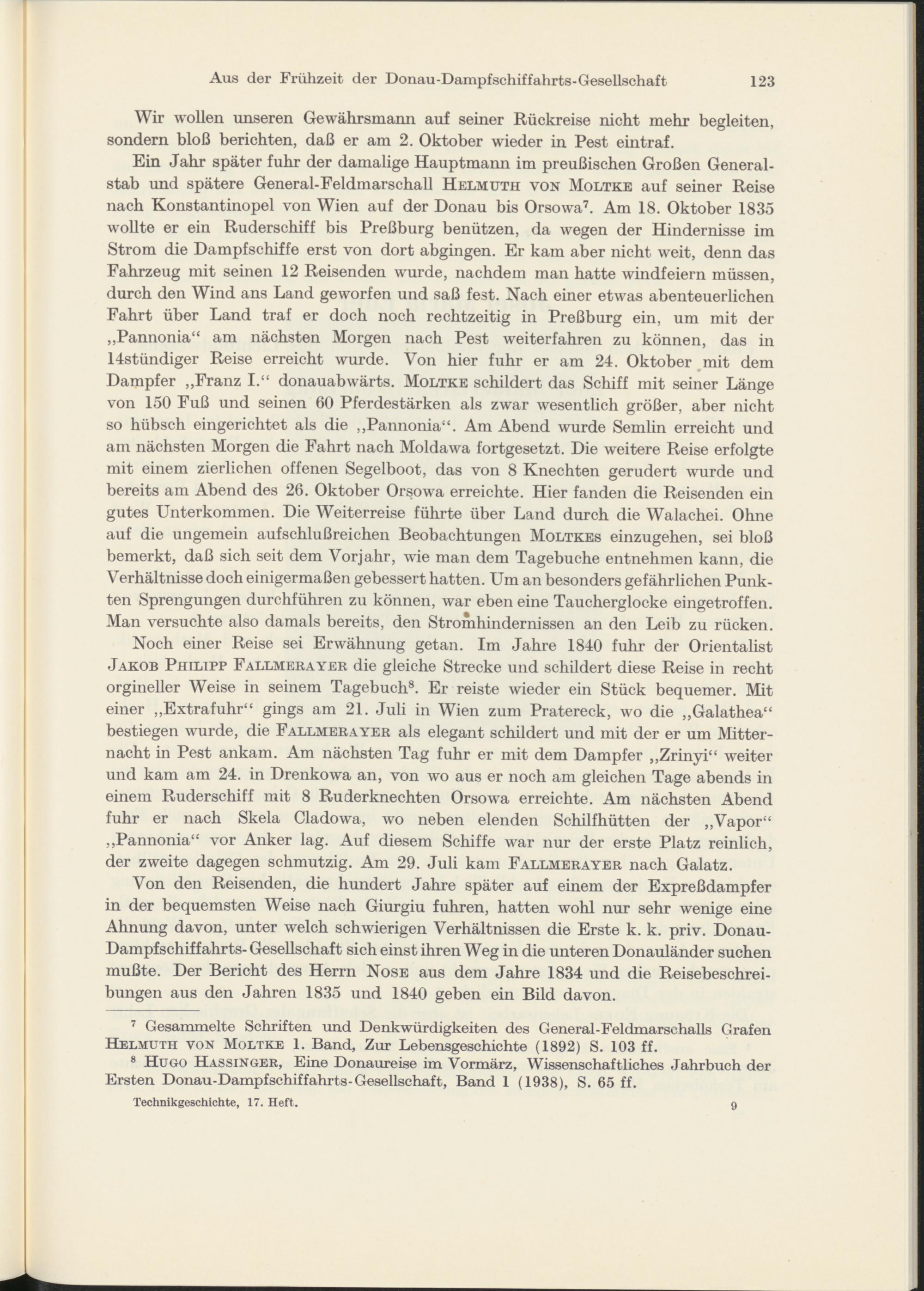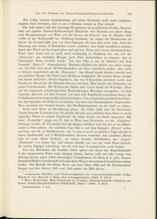 Ein Jahr später fuhr der damalige Hauptmann im preußischen Großen Generalstab und spätere General-Feldmarschall Helmuth von Moltke auf seiner Reise nach Konstantinopel von Wien auf der Donau bis Orsowa 7 . Am 18. Oktober 1835 wollte er ein Ruderschiff bis Preßburg benützen, da wegen der Hindernisse im Strom die Dampfschiffe erst von dort abgingen. Er kam aber nicht weit, denn das Fahrzeug mit seinen 12 Reisenden wurde, nachdem man hatte windfeiern müssen, durch den Wind ans Land geworfen und saß fe3t. Nach einer etwas abenteuerlichen Fahrt über Land traf er doch noch rechtzeitig in Preßburg ein, um mit der „Pannonia“ am nächsten Morgen nach Pest weiterfahren zu können, das in 14stündiger Reise erreicht wurde. Von hier fuhr er am 24. Oktober mit dem Dampfer „Franz I.“ donauabwärts. Moltke schildert das Schiff mit seiner Länge von 150 Fuß und seinen 60 Pferdestärken als zwar wesentlich größer, aber nicht so hübsch eingerichtet als die „Pannonia“. Am Abend wurde Semlin erreicht und am nächsten Morgen die Fahrt nach Moldawa fortgesetzt. Die weitere Reise erfolgte mit einem zierlichen offenen Segelboot, das von 8 Knechten gerudert wurde und bereits am Abend des 26. Oktober Orsowa erreichte. Hier fanden die Reisenden ein gutes Unterkommen. Die Weiterreise führte über Land durch die Walachei. Ohne auf die ungemein aufschlußreichen Beobachtungen Moltkes einzugehen, sei bloß bemerkt, daß sich seit dem Vorjahr, wie man dem Tagebuche entnehmen kann, die Verhältnisse doch einigermaßen gebessert hatten. Um an besonders gefährlichen Punkten Sprengungen durchführen zu können, war eben eine Taucherglocke eingetroffen. Man versuchte also damals bereits, den Stromhindernissen an den Leib zu rücken.