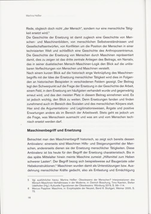 Die Geschichte der Ersetzung ist damit zugleich eine Geschichte von Menschen- und Maschinenbildern, von menschlichen Selbstverständnissen und Gesellschaftsentwürfen, von Konflikten um die Position der Menschen in einer technisierten Welt und schließlich eine Geschichte des Anthropozentrismus. Die Geschichte der Ersetzung von Menschen durch Maschinen repräsentiert damit, dies zu zeigen ist das dritte zentrale Anliegen des Beitrags, ein Narrativ, das in seiner dualistischen Mensch-Maschinen-Logik den Blick auf die unlösbaren Verflechtungen von Menschen und Maschinen verstellt.