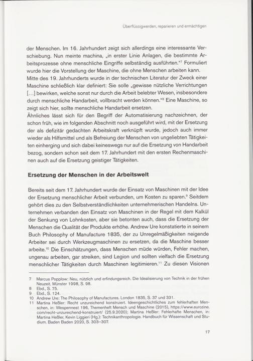 Bereits seit dem 17. Jahrhundert wurde der Einsatz von Maschinen mit der Idee der Ersetzung menschlicher Arbeit verbunden, um Kosten zu sparen. 9 Seitdem gehört dies zu den Selbstverständlichkeiten unternehmerischen Handelns. Unternehmen verbanden den Einsatz von Maschinen in der Regel mit dem Kalkül der Senkung von Lohnkosten, aber sie betonten auch, dass die Ersetzung der Menschen die Qualität der Produkte erhöhe. Andrew Ure konstatierte in seinem Buch Philosophy of Manufacture 1835, der zu Unregelmäßigkeiten neigende Arbeiter sei durch Werkzeugmaschinen zu ersetzen, da die Maschine besser arbeite. 10 Die Einschätzungen, dass Menschen müde würden, Fehler machen, ungenau arbeiten, gar streiken, sind Legion und sollten vielfach die Ersetzung menschlicher Tätigkeiten durch Maschinen legitimieren. * 11 Zu diesen Visionen