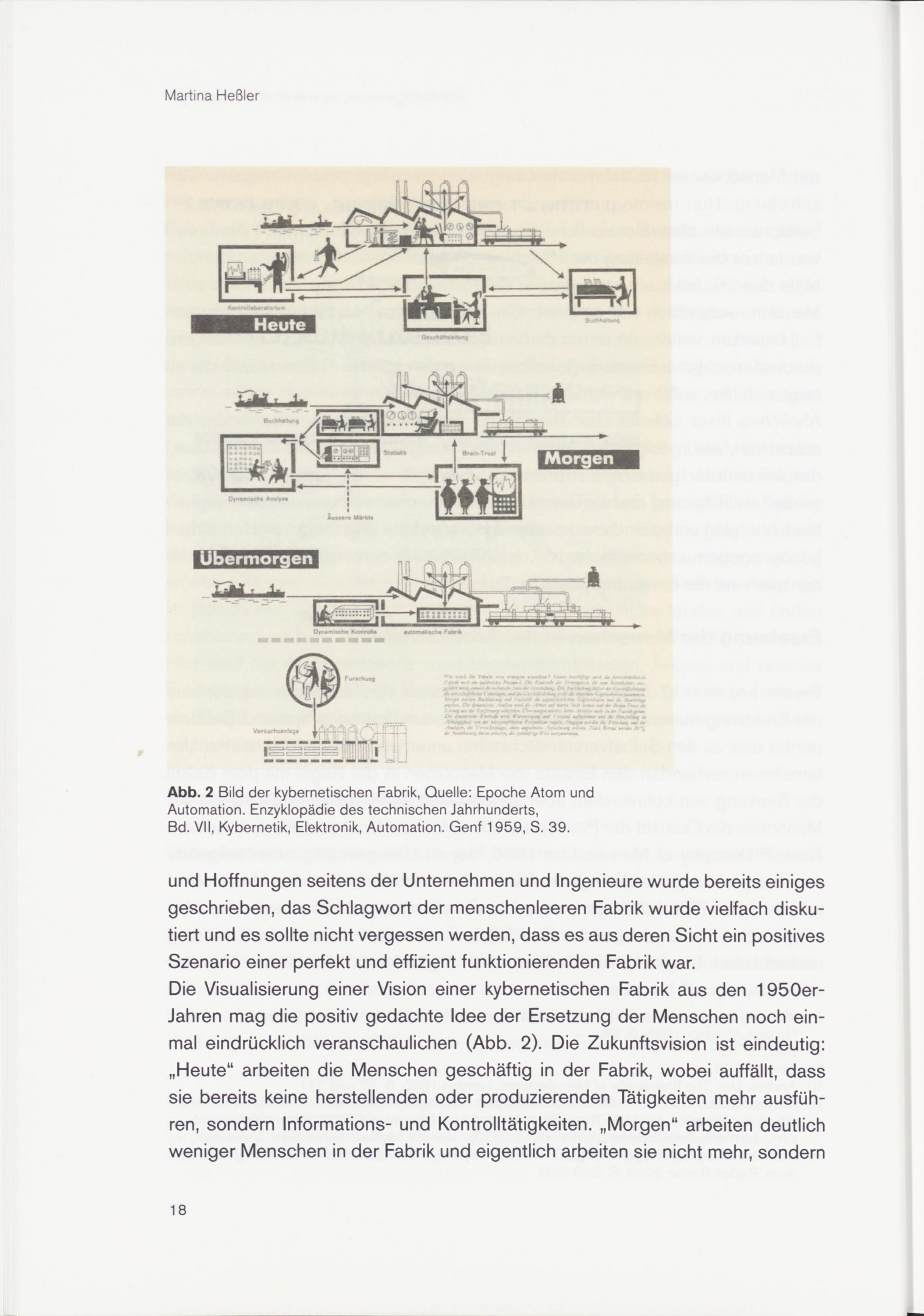 Die Visualisierung einer Vision einer kybernetischen Fabrik aus den 1950er- Jahren mag die positiv gedachte Idee der Ersetzung der Menschen noch einmal eindrücklich veranschaulichen (Abb. 2). Die Zukunftsvision ist eindeutig: „Heute“ arbeiten die Menschen geschäftig in der Fabrik, wobei auffällt, dass sie bereits keine herstellenden oder produzierenden Tätigkeiten mehr ausführen, sondern Informations- und Kontrolltätigkeiten. „Morgen“ arbeiten deutlich weniger Menschen in der Fabrik und eigentlich arbeiten sie nicht mehr, sondern