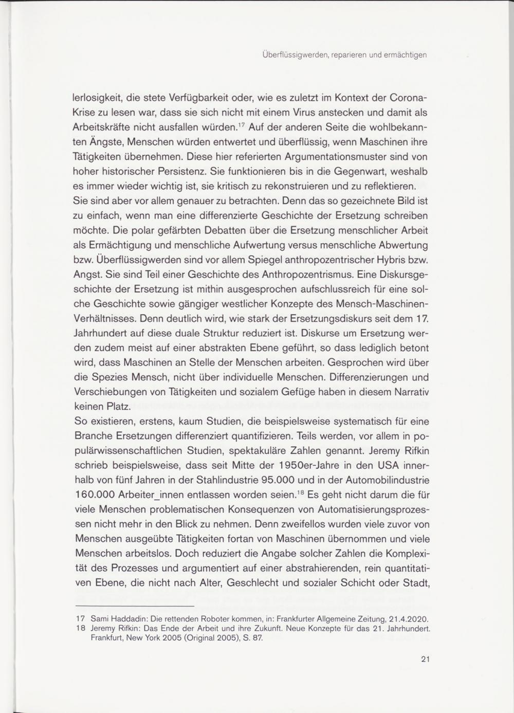 lerlosigkeit, die stete Verfügbarkeit oder, wie es zuletzt im Kontext der Corona- Krise zu lesen war, dass sie sich nicht mit einem Virus anstecken und damit als Arbeitskräfte nicht ausfallen würden. 17 Auf der anderen Seite die wohlbekannten Ängste, Menschen würden entwertet und überflüssig, wenn Maschinen ihre Tätigkeiten übernehmen. Diese hier referierten Argumentationsmuster sind von hoher historischer Persistenz. Sie funktionieren bis in die Gegenwart, weshalb es immer wieder wichtig ist, sie kritisch zu rekonstruieren und zu reflektieren. Sie sind aber vor allem genauer zu betrachten. Denn das so gezeichnete Bild ist zu einfach, wenn man eine differenzierte Geschichte der Ersetzung schreiben möchte. Die polar gefärbten Debatten über die Ersetzung menschlicher Arbeit als Ermächtigung und menschliche Aufwertung versus menschliche Abwertung bzw. Überflüssigwerden sind vor allem Spiegel anthropozentrischer Hybris bzw. Angst. Sie sind Teil einer Geschichte des Anthropozentrismus. Eine Diskursgeschichte der Ersetzung ist mithin ausgesprochen aufschlussreich für eine solche Geschichte sowie gängiger westlicher Konzepte des Mensch-Maschinen- Verhältnisses. Denn deutlich wird, wie stark der Ersetzungsdiskurs seit dem 17. Jahrhundert auf diese duale Struktur reduziert ist. Diskurse um Ersetzung werden zudem meist auf einer abstrakten Ebene geführt, so dass lediglich betont wird, dass Maschinen an Stelle der Menschen arbeiten. Gesprochen wird über die Spezies Mensch, nicht über individuelle Menschen. Differenzierungen und Verschiebungen von Tätigkeiten und sozialem Gefüge haben in diesem Narrativ keinen Platz.