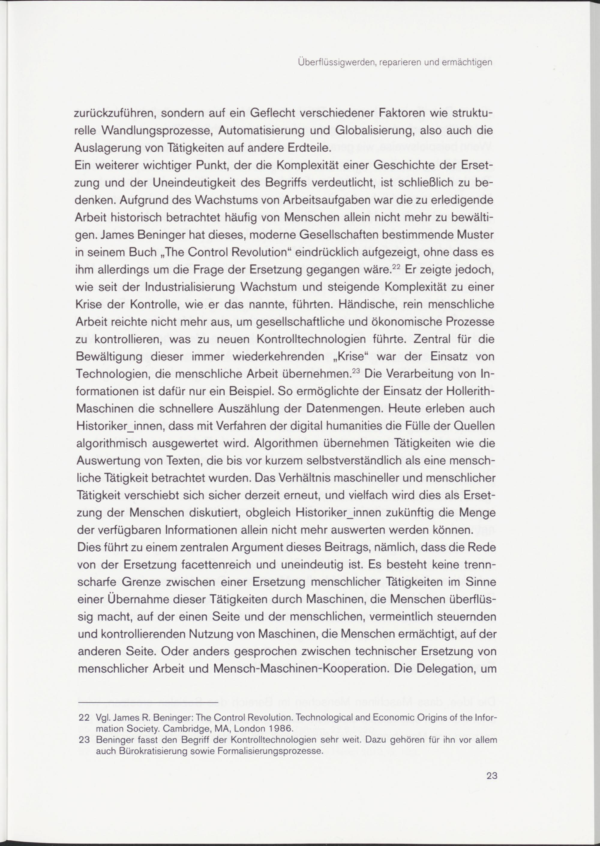 Ein weiterer wichtiger Punkt, der die Komplexität einer Geschichte der Ersetzung und der Uneindeutigkeit des Begriffs verdeutlicht, ist schließlich zu bedenken. Aufgrund des Wachstums von Arbeitsaufgaben war die zu erledigende Arbeit historisch betrachtet häufig von Menschen allein nicht mehr zu bewältigen. James Beninger hat dieses, moderne Gesellschaften bestimmende Muster in seinem Buch „The Control Revolution“ eindrücklich aufgezeigt, ohne dass es ihm allerdings um die Frage der Ersetzung gegangen wäre . 22 Er zeigte jedoch, wie seit der Industrialisierung Wachstum und steigende Komplexität zu einer Krise der Kontrolle, wie er das nannte, führten. Händische, rein menschliche Arbeit reichte nicht mehr aus, um gesellschaftliche und ökonomische Prozesse zu kontrollieren, was zu neuen Kontrolltechnologien führte. Zentral für die Bewältigung dieser immer wiederkehrenden „Krise“ war der Einsatz von Technologien, die menschliche Arbeit übernehmen . 23 Die Verarbeitung von Informationen ist dafür nur ein Beispiel. So ermöglichte der Einsatz der Hollerith- Maschinen die schnellere Auszählung der Datenmengen. Heute erleben auch Historikerjnnen, dass mit Verfahren der digital humanities die Fülle der Quellen algorithmisch ausgewertet wird. Algorithmen übernehmen Tätigkeiten wie die Auswertung von Texten, die bis vor kurzem selbstverständlich als eine menschliche Tätigkeit betrachtet wurden. Das Verhältnis maschineller und menschlicher Tätigkeit verschiebt sich sicher derzeit erneut, und vielfach wird dies als Ersetzung der Menschen diskutiert, obgleich Historikerjnnen zukünftig die Menge der verfügbaren Informationen allein nicht mehr auswerten werden können.