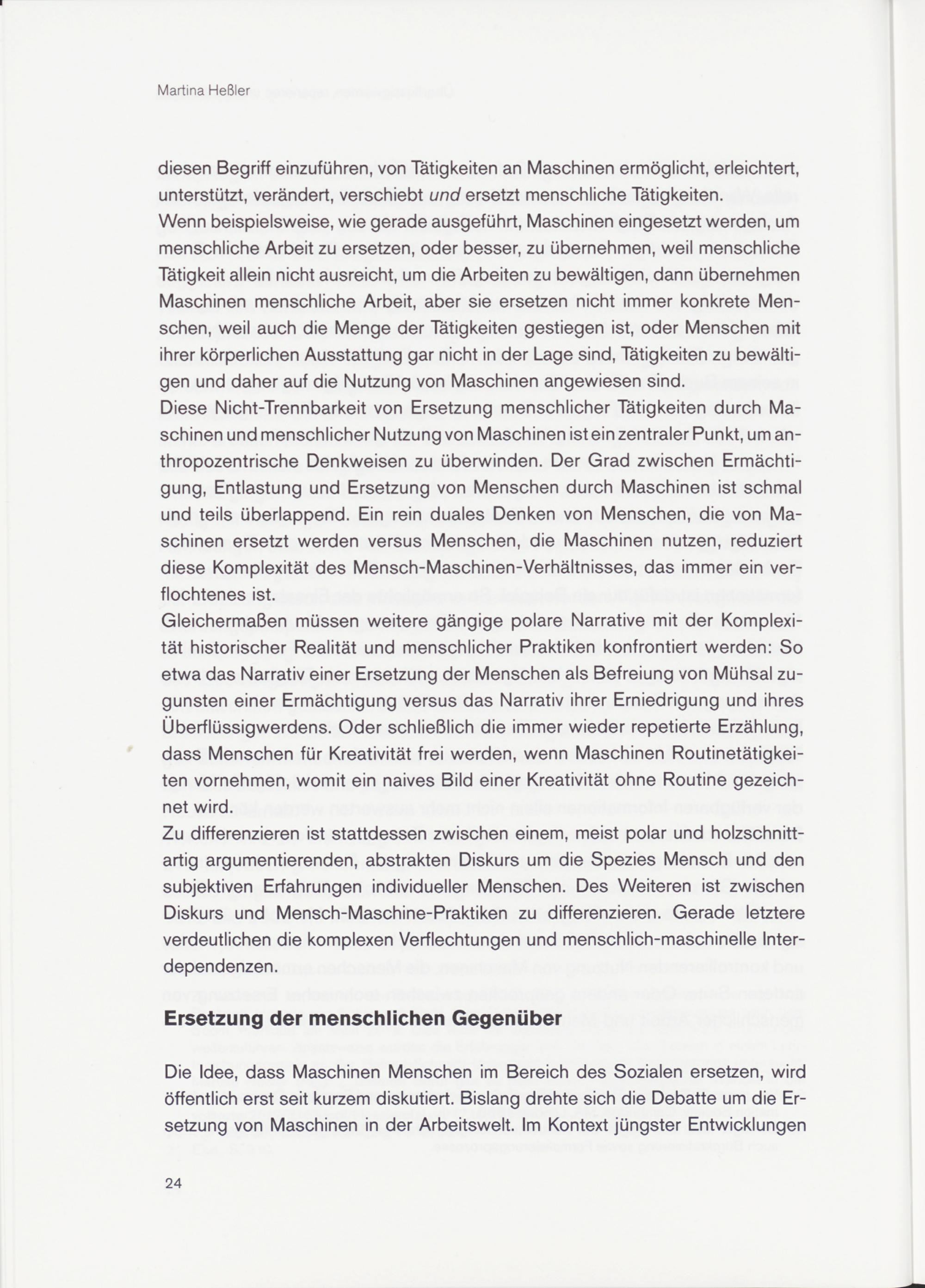 Diese Nicht-Trennbarkeit von Ersetzung menschlicher Tätigkeiten durch Maschinen und menschlicher Nutzung von Maschinen ist ein zentraler Punkt, um anthropozentrische Denkweisen zu überwinden. Der Grad zwischen Ermächtigung, Entlastung und Ersetzung von Menschen durch Maschinen ist schmal und teils überlappend. Ein rein duales Denken von Menschen, die von Maschinen ersetzt werden versus Menschen, die Maschinen nutzen, reduziert diese Komplexität des Mensch-Maschinen-Verhältnisses, das immer ein verflochtenes ist.