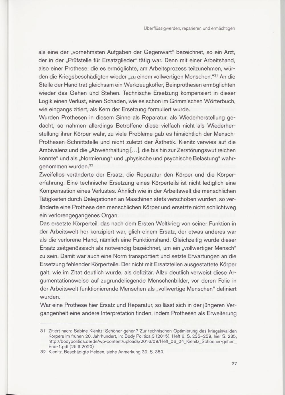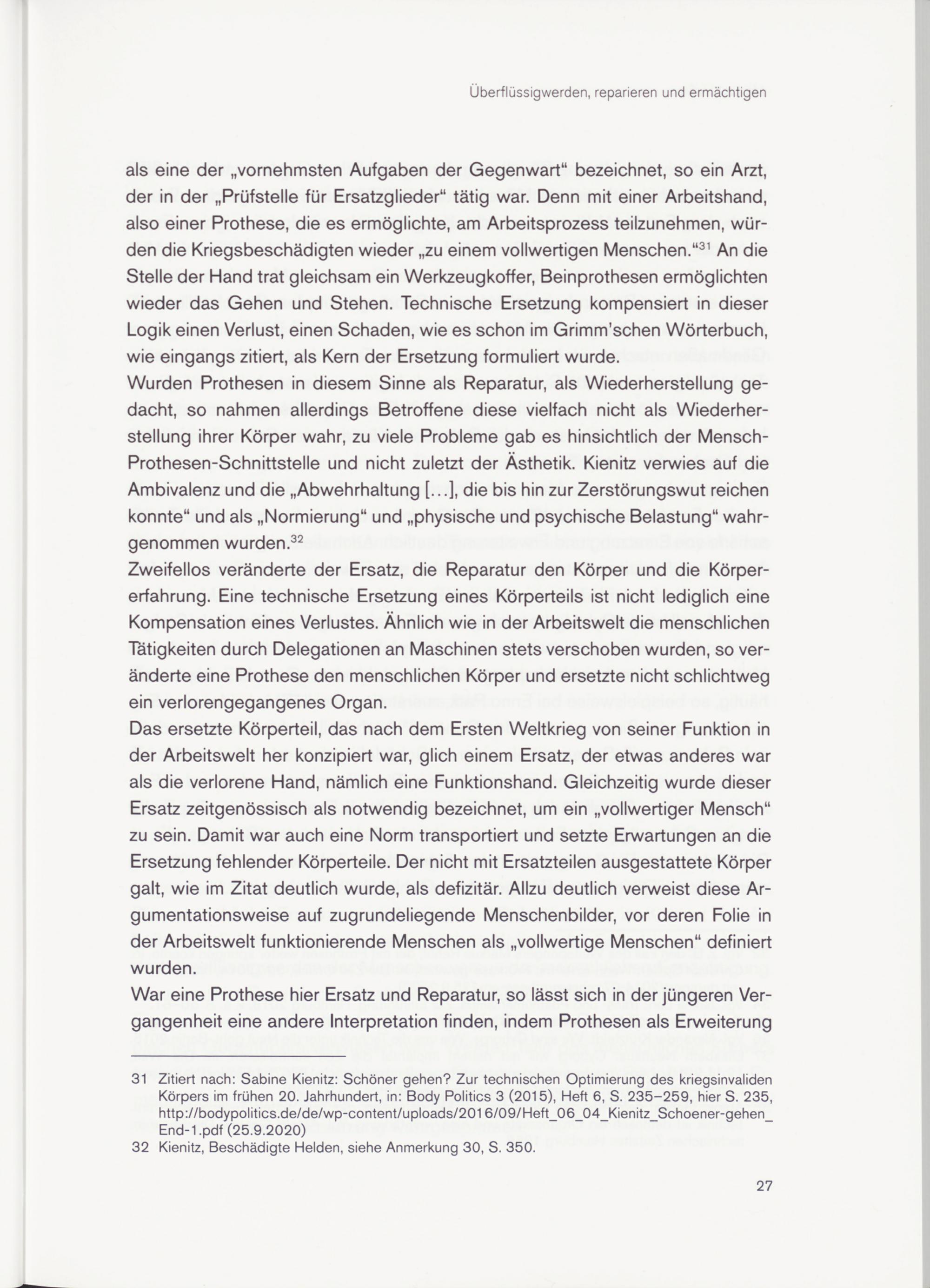 31 Zitiert nach: Sabine Kienitz: Schöner gehen? Zur technischen Optimierung des kriegsinvaliden Körpers im frühen 20. Jahrhundert, in: Body Politics 3 (2015), Heft 6, S. 235-259, hier S. 235, http://bodypolitics.de/de/wp-content/uploads/201 6/09/Heft_06_04_Kienitz_Schoener-gehen_ End-1 .pdf (25.9.2020)