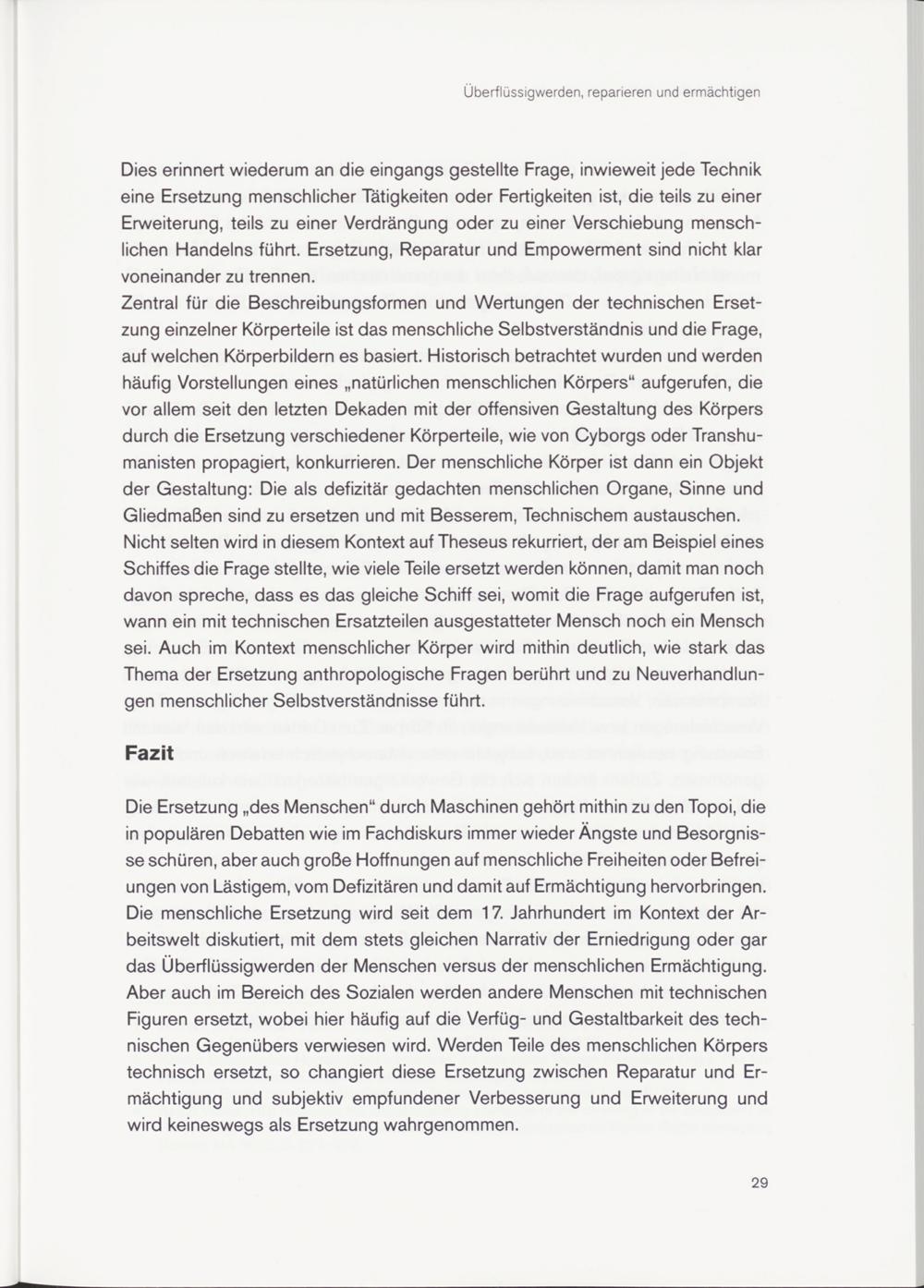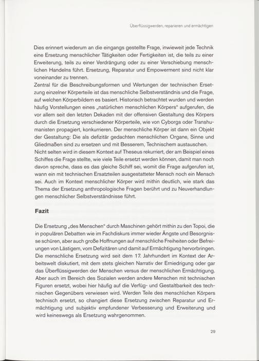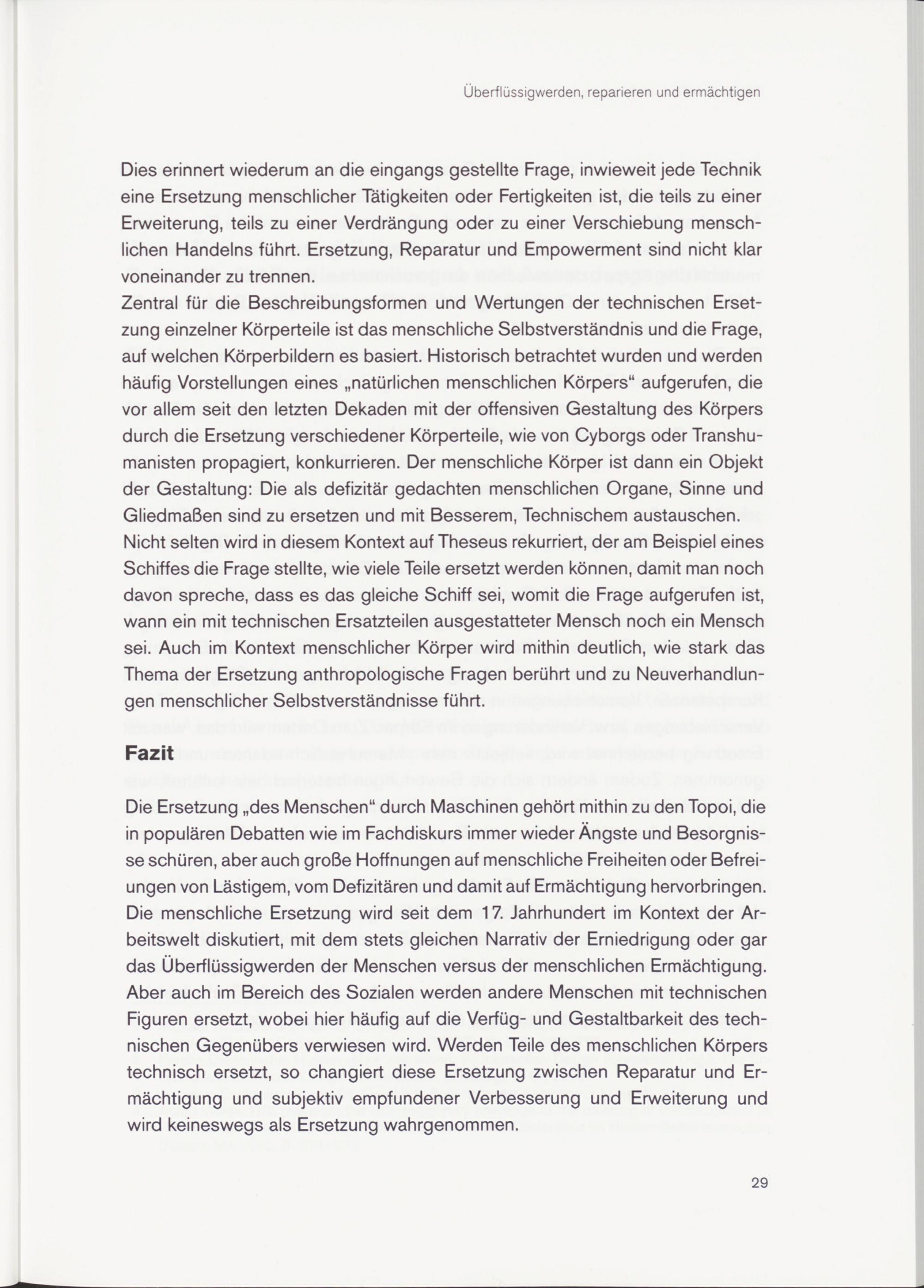 Die Ersetzung „des Menschen“ durch Maschinen gehört mithin zu den Topoi, die in populären Debatten wie im Fachdiskurs immer wieder Ängste und Besorgnisse schüren, aber auch große Hoffnungen auf menschliche Freiheiten oder Befreiungen von Lästigem, vom Defizitären und damit auf Ermächtigung hervorbringen. Die menschliche Ersetzung wird seit dem 17. Jahrhundert im Kontext der Arbeitswelt diskutiert, mit dem stets gleichen Narrativ der Erniedrigung oder gar das Überflüssigwerden der Menschen versus der menschlichen Ermächtigung. Aber auch im Bereich des Sozialen werden andere Menschen mit technischen Figuren ersetzt, wobei hier häufig auf die Verfüg- und Gestaltbarkeit des technischen Gegenübers verwiesen wird. Werden Teile des menschlichen Körpers technisch ersetzt, so changiert diese Ersetzung zwischen Reparatur und Ermächtigung und subjektiv empfundener Verbesserung und Erweiterung und wird keineswegs als Ersetzung wahrgenommen.