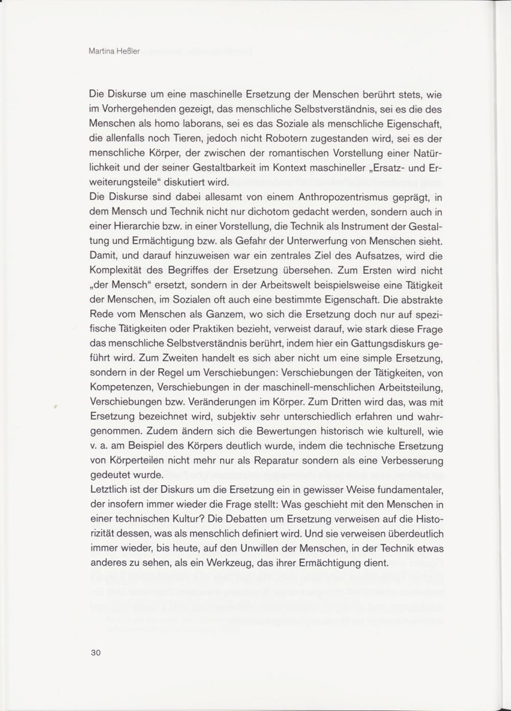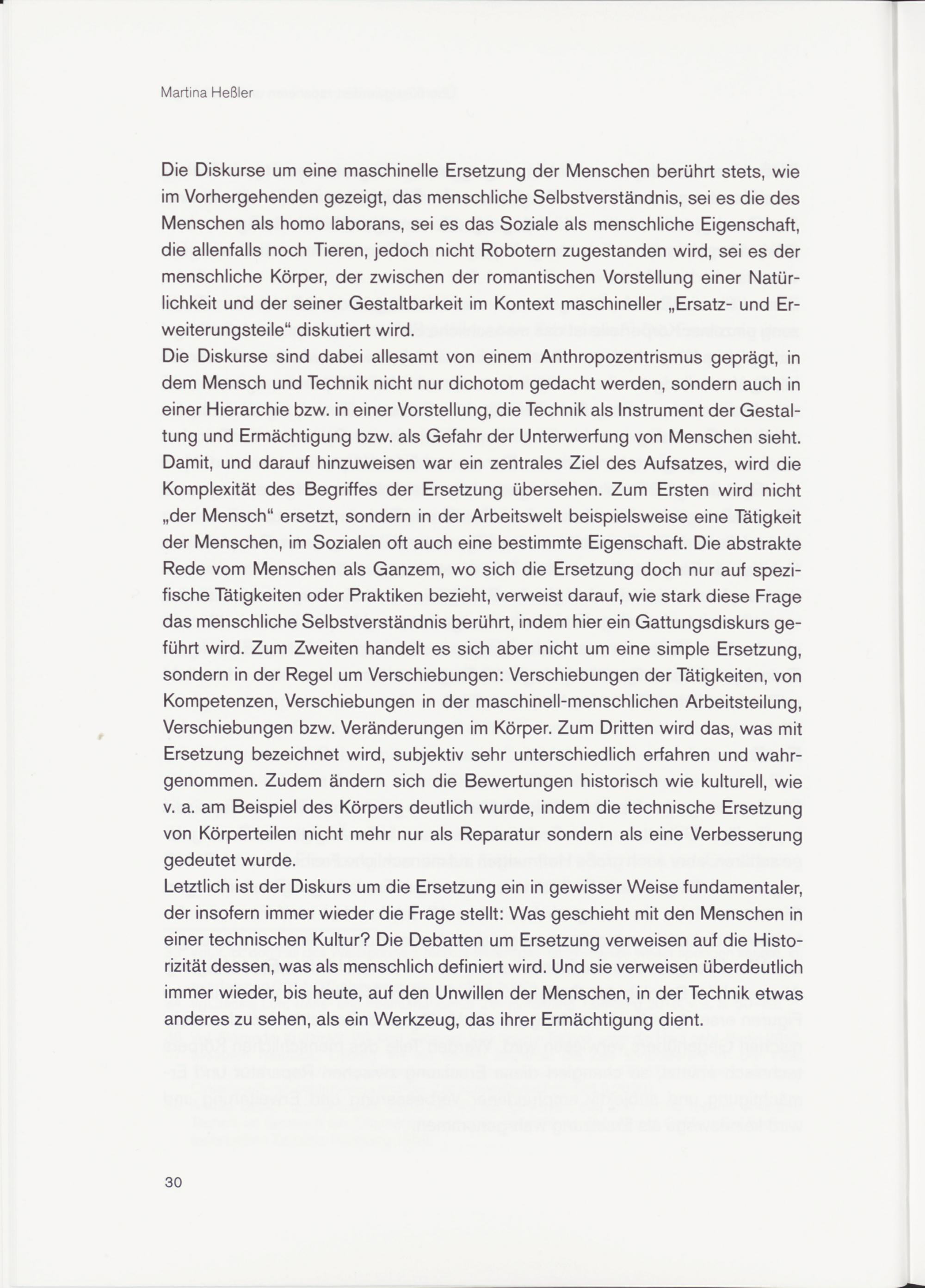 Letztlich ist der Diskurs um die Ersetzung ein in gewisser Weise fundamentaler, der insofern immer wieder die Frage stellt: Was geschieht mit den Menschen in einer technischen Kultur? Die Debatten um Ersetzung verweisen auf die Historizität dessen, was als menschlich definiert wird. Und sie verweisen überdeutlich immer wieder, bis heute, auf den Unwillen der Menschen, in der Technik etwas anderes zu sehen, als ein Werkzeug, das ihrer Ermächtigung dient.