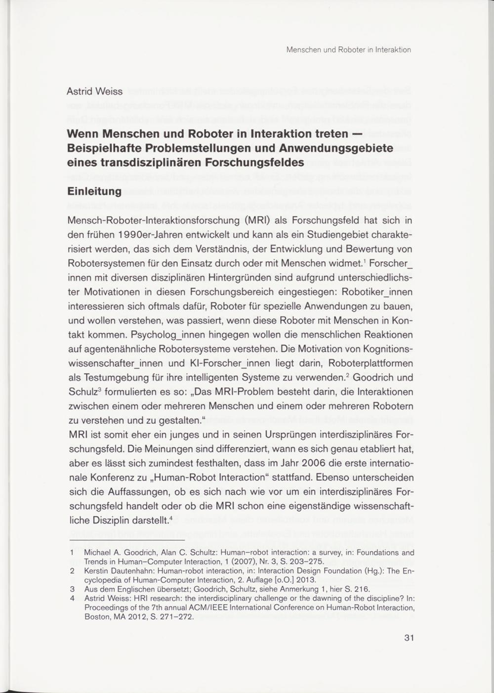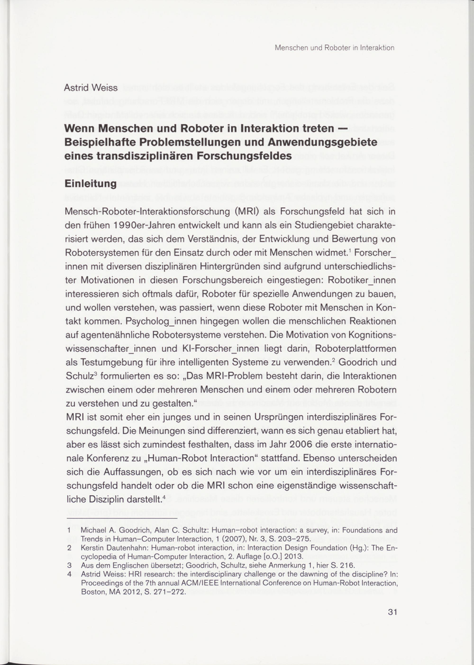 4 Astrid Weiss: HRI research: the interdisciplinary challenge or the dawning of the discipline? In: Proceedings of the 7th annual ACM/IEEE International Conference on Human-Robot Interaction, Boston, MA 2012, S. 271-272.