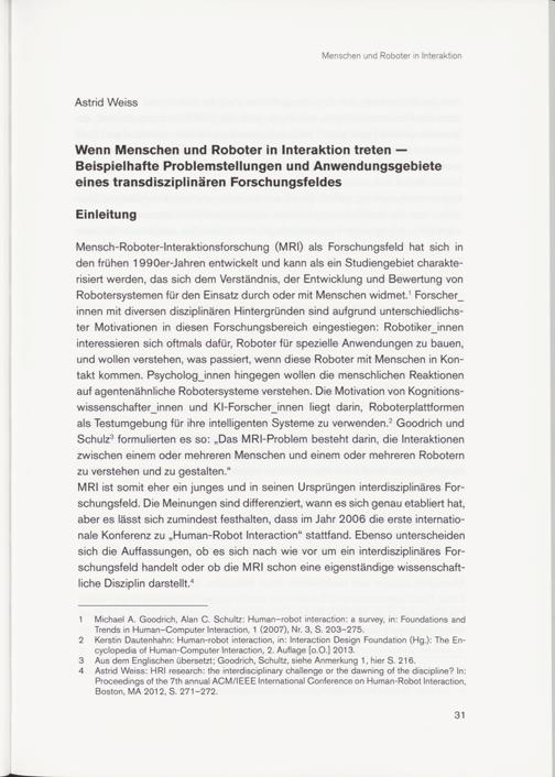 Mensch-Roboter-Interaktionsforschung (MRI) als Forschungsfeld hat sich in den frühen 1990er-Jahren entwickelt und kann als ein Studiengebiet charakterisiert werden, das sich dem Verständnis, der Entwicklung und Bewertung von Robotersystemen für den Einsatz durch oder mit Menschen widmet. 1 Forscher_ innen mit diversen disziplinären Hintergründen sind aufgrund unterschiedlichster Motivationen in diesen Forschungsbereich eingestiegen: Robotikerjnnen interessieren sich oftmals dafür, Roboter für spezielle Anwendungen zu bauen, und wollen verstehen, was passiert, wenn diese Roboter mit Menschen in Kontakt kommen. Psychologjnnen hingegen wollen die menschlichen Reaktionen auf agentenähnliche Robotersysteme verstehen. Die Motivation von Kognitions- wissenschafterjnnen und KI-Forscher_innen liegt darin, Roboterplattformen als Testumgebung für ihre intelligenten Systeme zu verwenden. 2 Goodrich und Schulz 3 formulierten es so: „Das MRI-Problem besteht darin, die Interaktionen zwischen einem oder mehreren Menschen und einem oder mehreren Robotern zu verstehen und zu gestalten.“