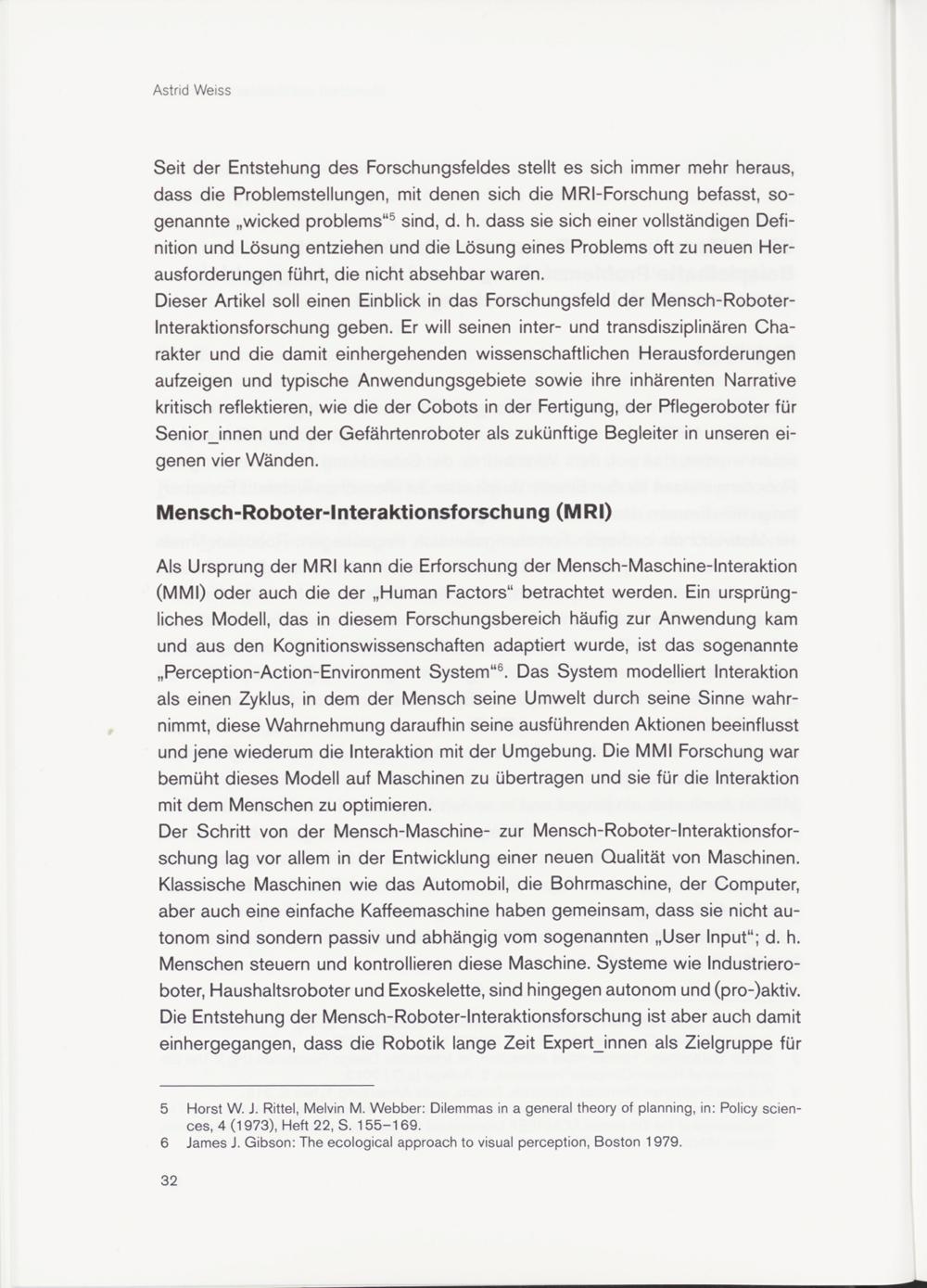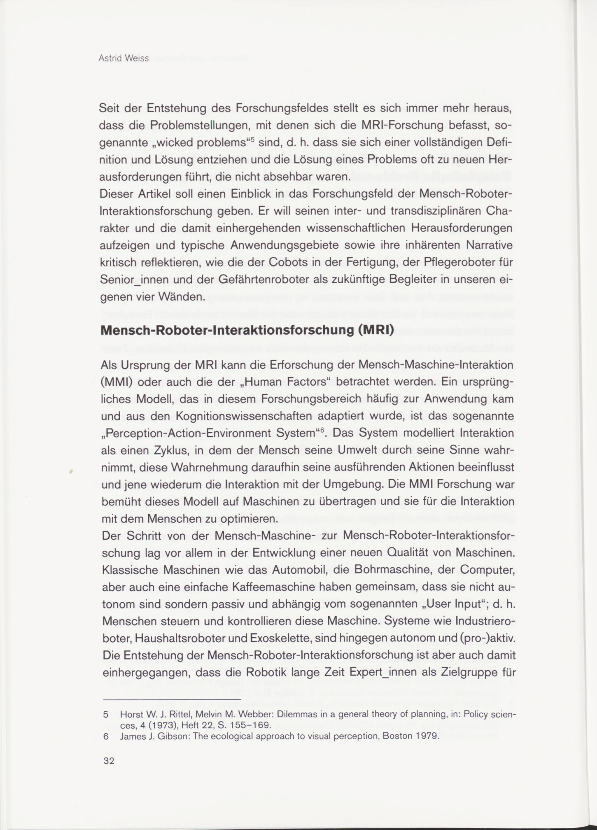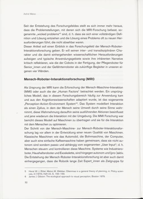 Dieser Artikel soll einen Einblick in das Forschungsfeld der Mensch-Roboter- Interaktionsforschung geben. Er will seinen inter- und transdisziplinären Charakter und die damit einhergehenden wissenschaftlichen Herausforderungen aufzeigen und typische Anwendungsgebiete sowie ihre inhärenten Narrative kritisch reflektieren, wie die der Cobots in der Fertigung, der Riegeroboter für Senior_innen und der Gefährtenroboter als zukünftige Begleiter in unseren eigenen vier Wänden.