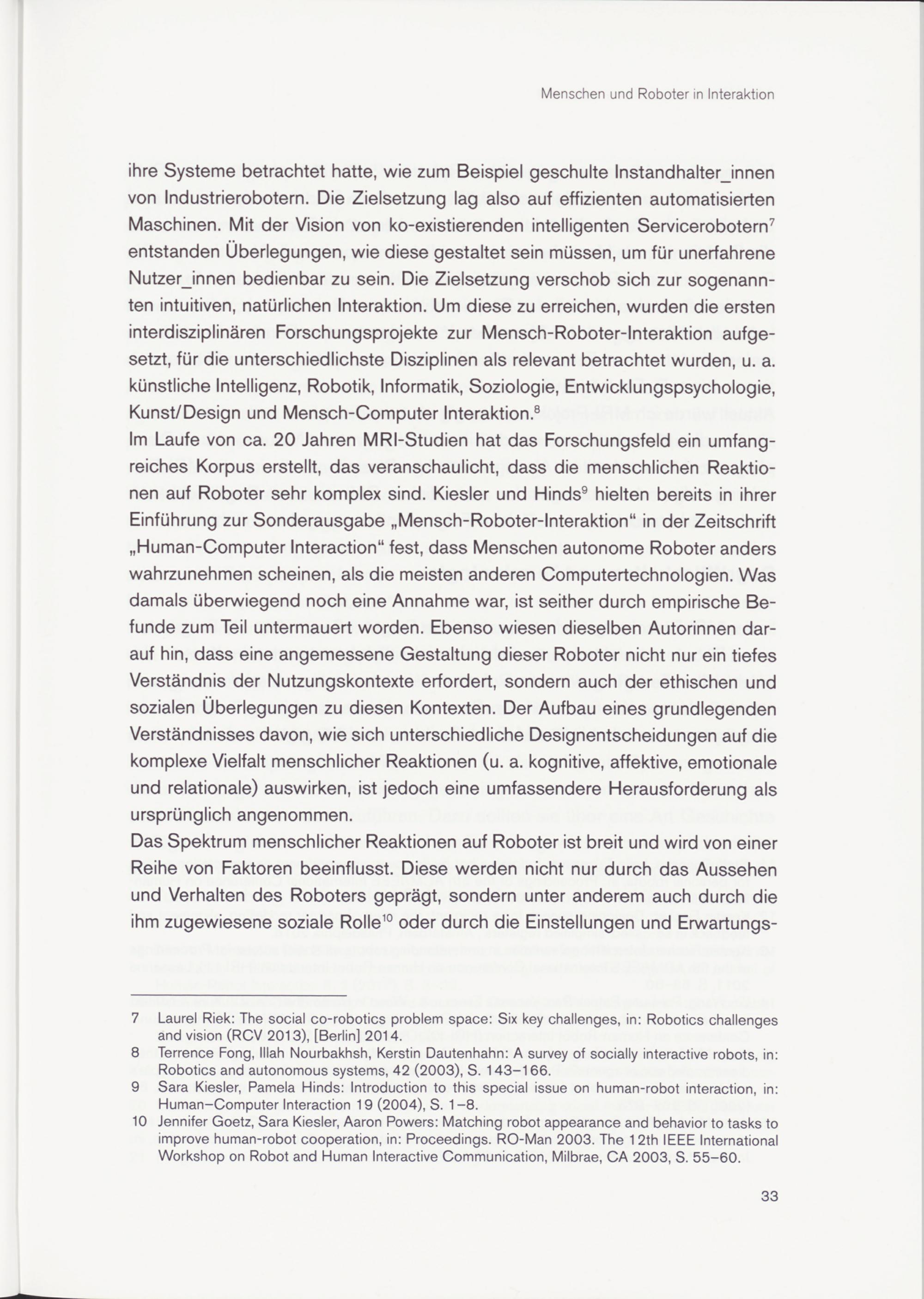 ihre Systeme betrachtet hatte, wie zum Beispiel geschulte Instandhalterjnnen von Industrierobotern. Die Zielsetzung lag also auf effizienten automatisierten Maschinen. Mit der Vision von ko-existierenden intelligenten Servicerobotern 7 entstanden Überlegungen, wie diese gestaltet sein müssen, um für unerfahrene Nutzerjnnen bedienbar zu sein. Die Zielsetzung verschob sich zur sogenannten intuitiven, natürlichen Interaktion. Um diese zu erreichen, wurden die ersten interdisziplinären Forschungsprojekte zur Mensch-Roboter-Interaktion aufgesetzt, für die unterschiedlichste Disziplinen als relevant betrachtet wurden, u. a. künstliche Intelligenz, Robotik, Informatik, Soziologie, Entwicklungspsychologie, Kunst/Design und Mensch-Computer Interaktion. 8
